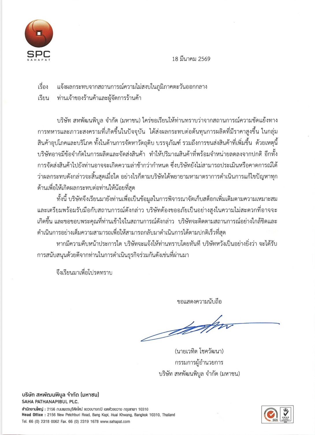 ล่าสุดวันทึ่ 18 มีนาคม 2569 บริษัท สหพัฒนพิบูล จำกัด (มหาชน) ทำหนังสือถึงผู้ค้า ระบุว่า