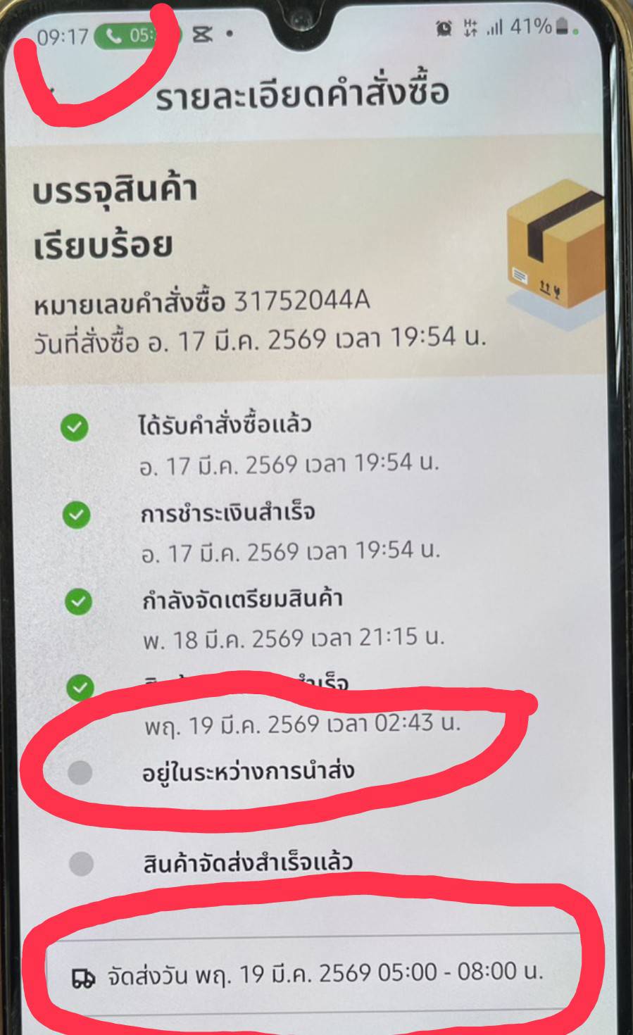 สั่งซื้อสินค้าวันที่ 17 ออเดอร์ถูกแบ่งเป็น 2 บิล ส่ง 2 รอบ รอบแรกได้รับวันที่ 18 รอบที่ 2 รอบเวลาจัดส่งวันที่ 19 ตี 5 ถึง 8:00 น ตอนนี้ยังไม่ได้รับโทรตาม call center ครั้งแรกรับบอกจะตามให้เคสเร่งด่วนตอนนี้จะ 10 โมงของยังมาไม่ถึง call center ไม่มีผู้รับสาย