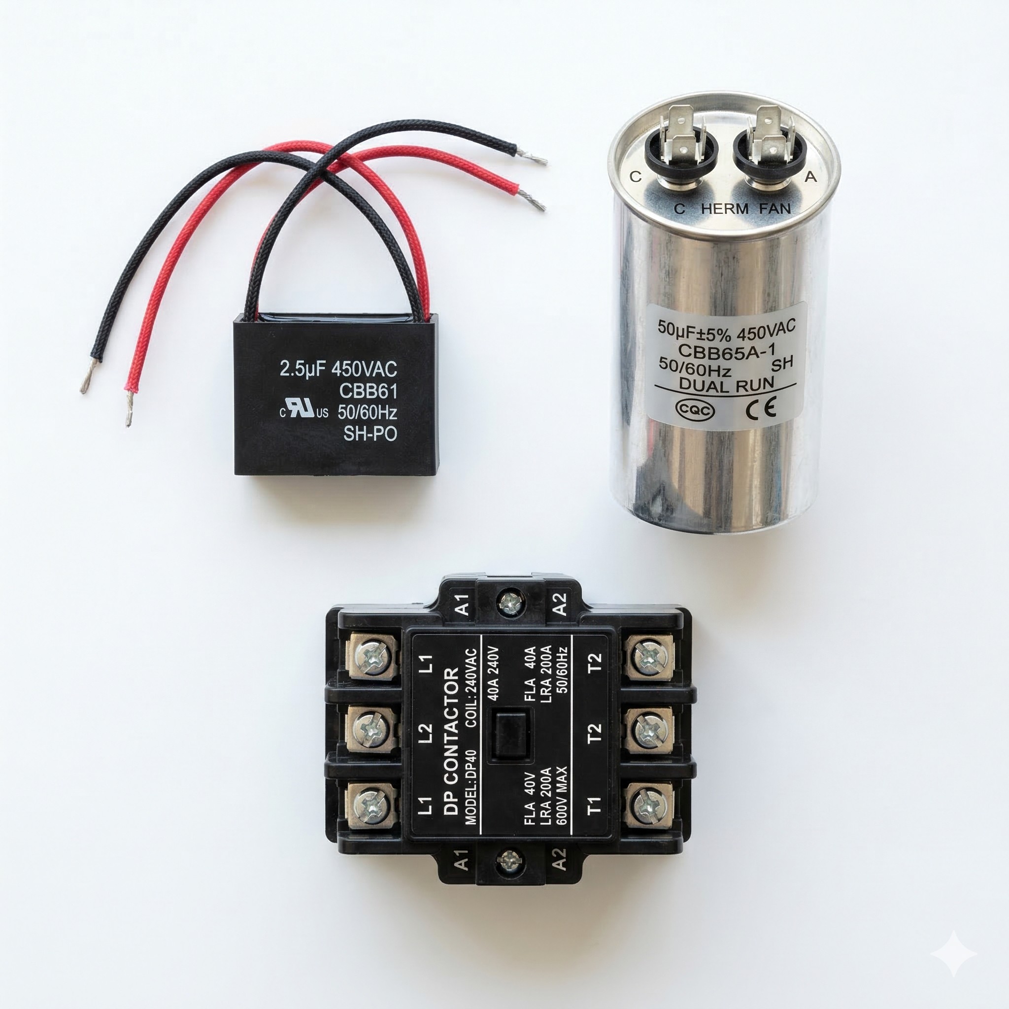 3 ตัวนี้อยู่ในคอยส์ร้อยแอร์ ถ้าใช้มานานแล้วอยู่ดีๆ ไม่เย็น พัดลมคอยร้อนไม่หมุน ลองเอามือไปหมุนใบพัด ถ้าฝืดแสดงว่าเป็นที่มอเตอร์ ถ้าไหลดีก็ต้องมาดู 3 ตัวนี้ ภาพตัวแมคเนติกส์สีดำด้านล่างอาจไม่ค่อยตรงรุ่นเท่าไหร่ แต่ขอให้เข้าใจว่ามันเป็นตัวตัดต่อจ่ายไฟไปคอมฯ ส่วนสองตัวบนคือ คาปาสำหรับหมุนใบพัดพัดลมและคอม ไหนๆใช้งานมาพอๆ กันแล้ว ก็เปลี่ยนมันซะทีเดียวเลย เอาคัทเอ้าลง เช็คไฟไม่มีแล้ว ก็เริ่มถอดสายไฟ ถ่ายรูปจำการเข้าสายไว้ก่อนนะครับ เวลาเข้าสายไฟจะได้ถูกต้องเหมือนเดิม หมูๆ ผู้หญิงก็เปลี่ยนได้ แต่ขอให้ปลอดไฟก่อนทำ และเข้าสายให้ถูกให้แน่นเป็นใช่ได้ พอเอาเบรคเกอร์ขึ้น เปิดแอร์ จะมีแต่ลมก่อนสัก 3 นาที จากนั้นเมื่อคาปาเก็บประจุพร้อมแล้วก็จะเริ่มจ่ายไฟตามปกติ แอร์ก็จะกลับมาทำงานเย็นเหมือนเดิม ส่วนอะไหล่ก็หาซื้อได้ตามมาร์เก็ตเพลสดังๆ หรือร้านค้าส่งทั่ว ๆไป ขอให้ตรงรุ่น ตรงขนาดเป็นใช้ได้ งบก็ไม่เกิน 500 บาท ใช้ได้อีกยาวๆ