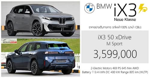 ราคาอย่างเป็นทางการ BMW iX3 Neue Klasse (NA5) รถไฟฟ้า100% : 3,599,000 บาท (นำเข้า CBU เยอรมนี) วิ่งระยะ 805 km. (WLTP) แบต 800V 113.4 kWh ชาร์จ AC 22 kW / DC 400 kW มอเตอร์คู่ 469 แรงม้า ขับ4 xDrive