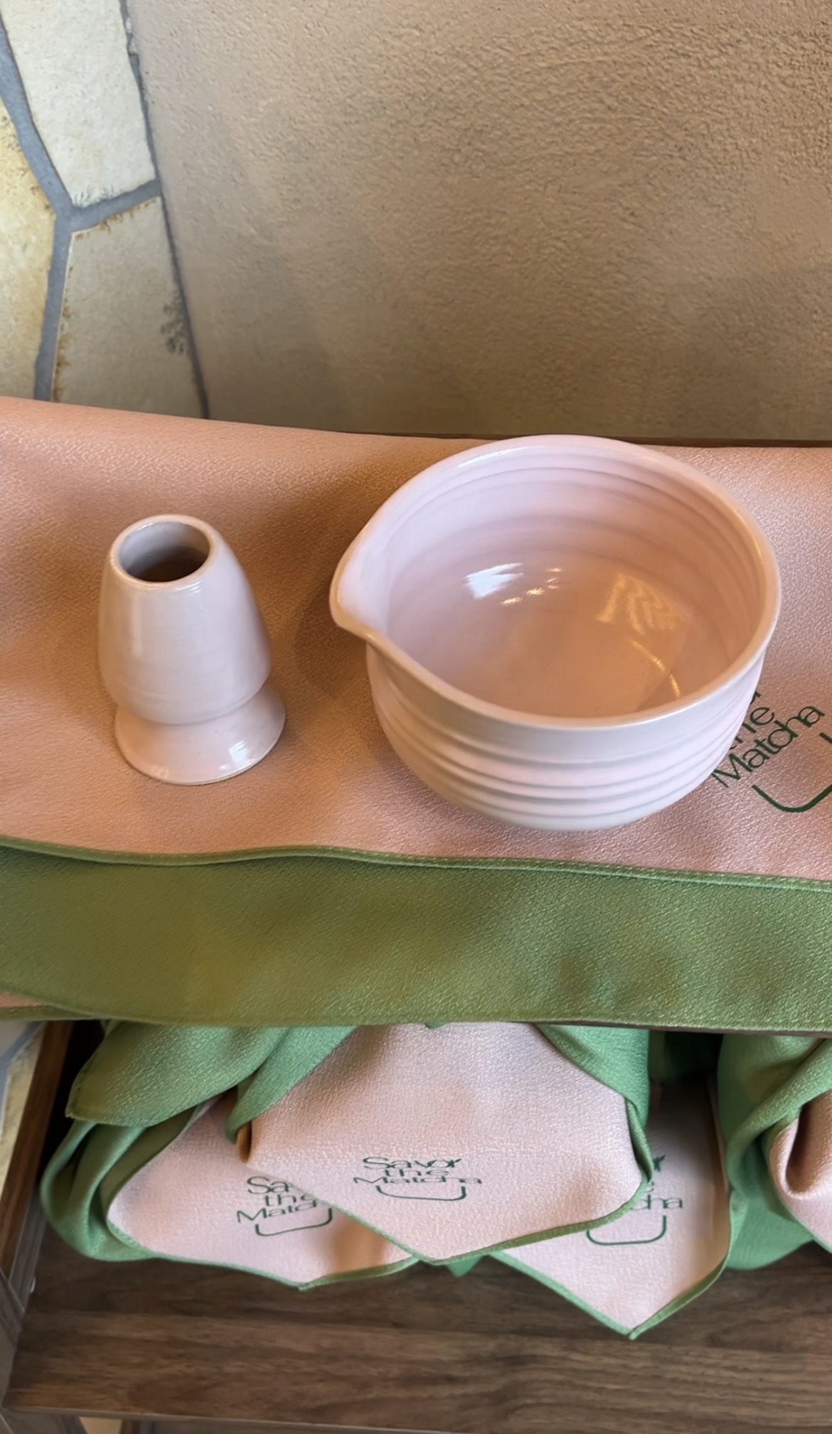 นอกจากเครื่องดื่มแล้ว ที่ร้านยังมีเซ็ตชงชาด้วย ถ้วยชาขายคู่กับที่วางฉะเซ็น(ไม้ไผ่ตีมัทฉะ) แบบว่า เห็นแล้วรักเลย สีชมพูถูกต้องมากกกกกก ก็เลยสอยมาเรียบร้อยค่ะ555555555