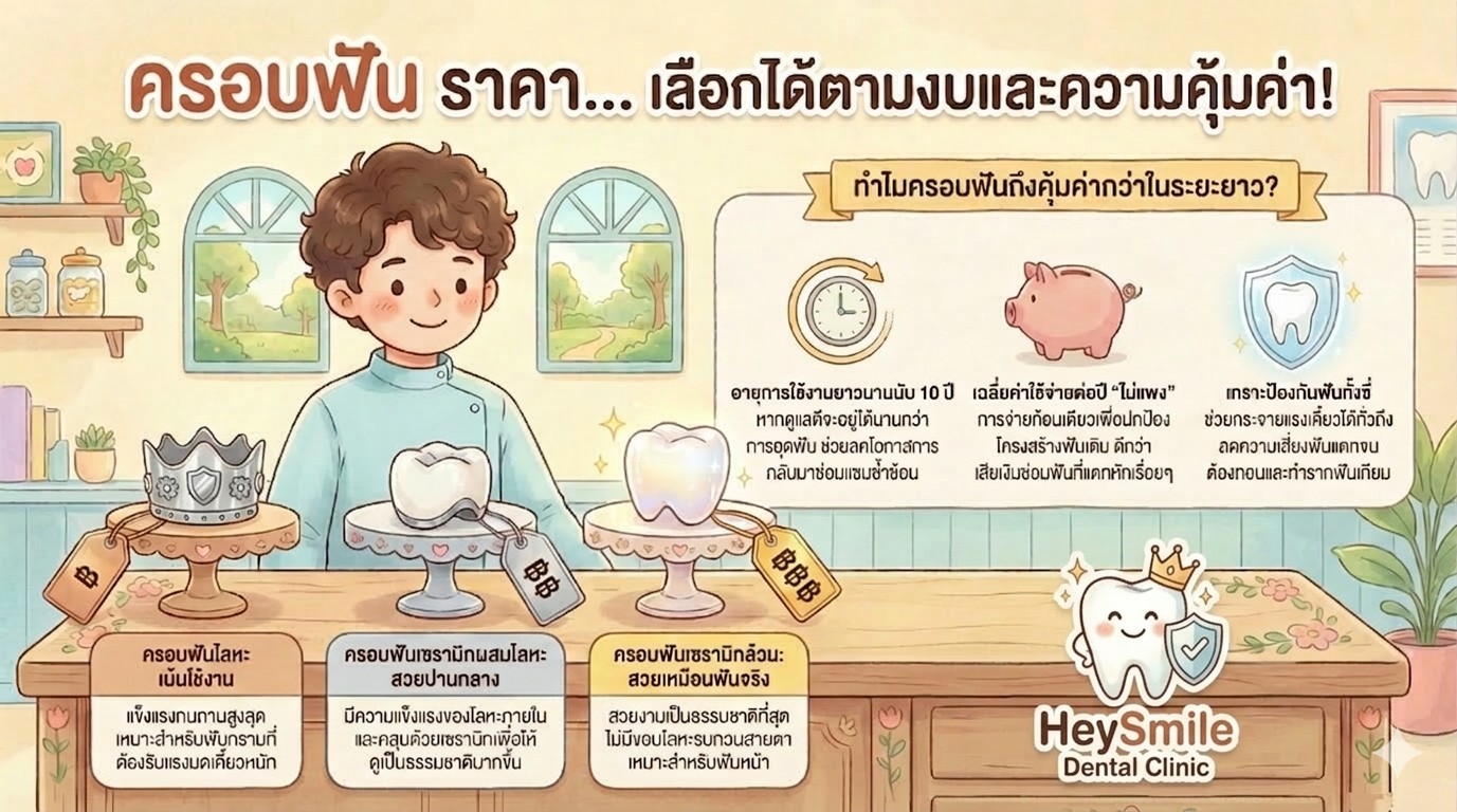 ลองคิดแบบ "ค่าใช้จ่ายเฉลี่ยต่อปี" ดูครับ การเลือกวิธีที่ถูกกว่าแต่ฟันพังซ้ำๆ ต้องเสียเงินซ่อมเรื่อยๆ (เผลอๆ อาจถึงขั้นต้องถอนแล้วทำรากฟันเทียมที่แพงกว่าเดิม) เทียบกับการทำครอบฟันที่จ่ายก้อนเดียวจบ แต่อยู่ไปได้อีกเป็นสิบปี การมองในระยะยาวจะทำให้เราเห็นความคุ้มค่าที่แท้จริงครับ