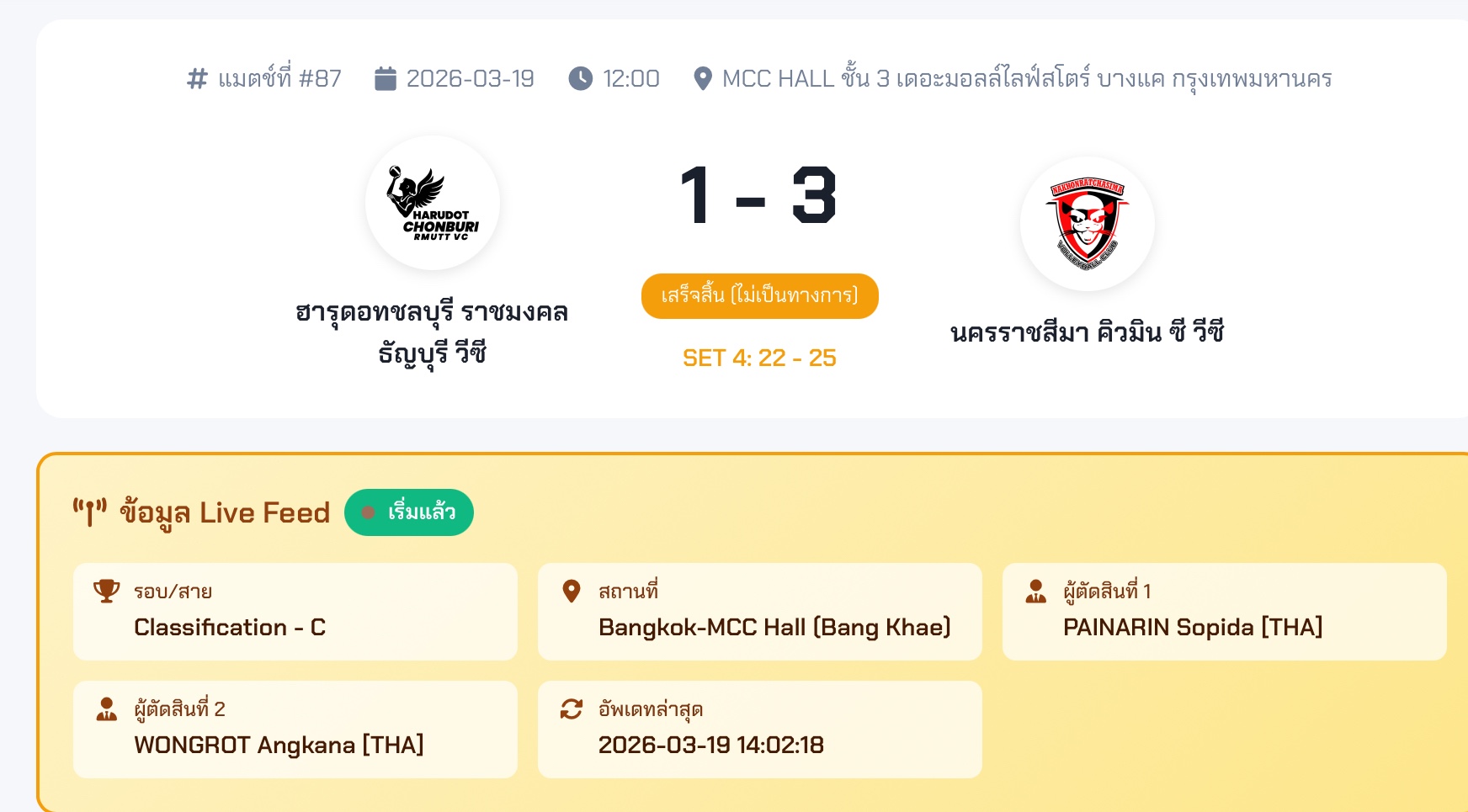 Harudot Chonburi RMUTT VC 1-3 Nakhon Ratchasima Qmin C VC (25-19 16-25 19-25 22-25)