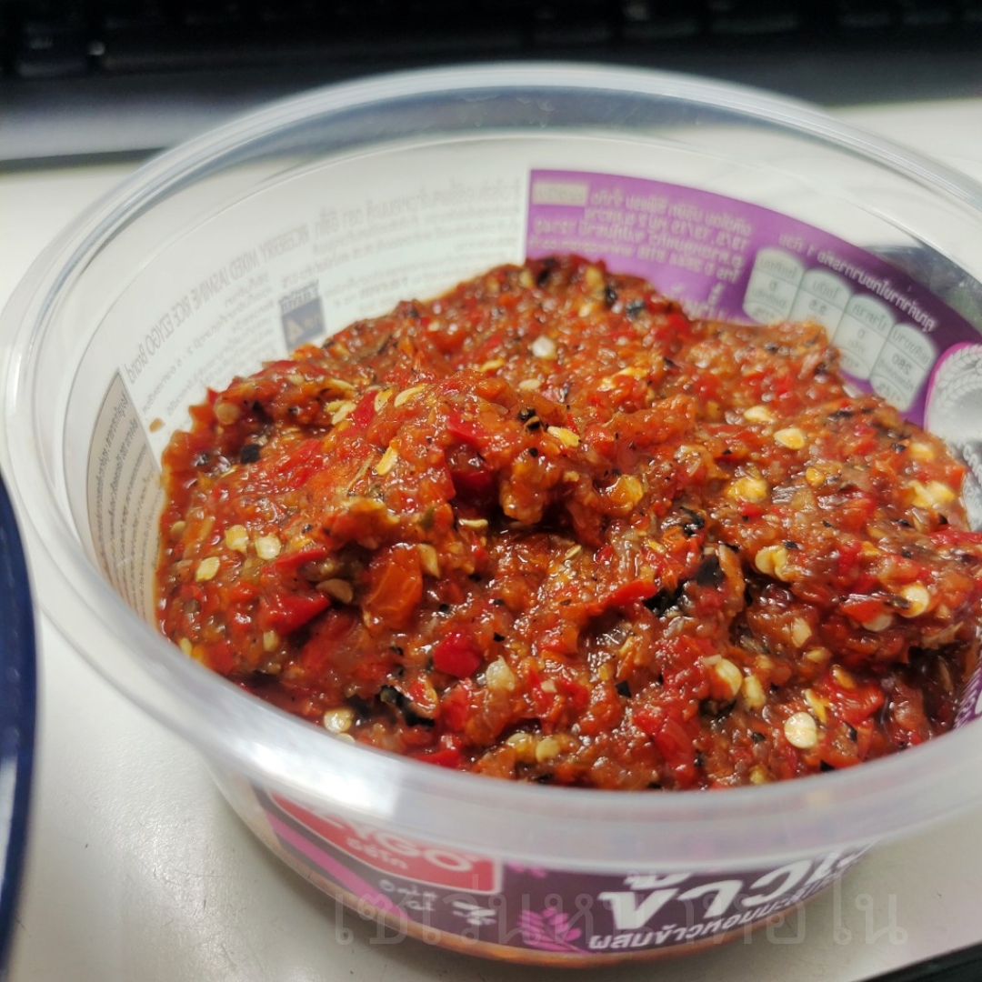 เพื่อนบ้านบอกว่ามีแต่พริกแดง เลยเป็นน้ำพริกขี้กาสีแดง ดูน่ากินดีครับ