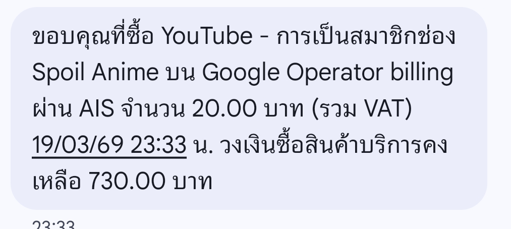 สวัสดีค่ะ พอดีเราสมัครยูทูปพรีเมี่ยมกับ AIS มาสักพักแล้วแต่จู่ๆเดือนนี้เพิ่งตัดรอบค่าบริการไปเมื่อวันที่ 12 ตุลาคม 2567 ที่ผ่านมาแต่พอมาวันที่ 13 ตุลาคม กลับใช้งานไม่ได้และขึ้นว่าหมดอายุ ทั้งที่เช็คใน