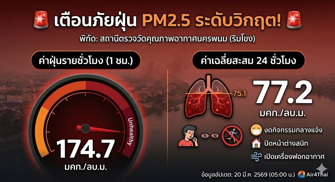 🚨 [เตือนสกลนคร] วิกฤต PM2.5 แดงเถือก! รายชั่วโมงพุ่งทะลุ 174 ดึงค่าเฉลี่ย 24 ชม. ทะลุจุดอันตรายแล้ว งดออกบ้านด่วน!