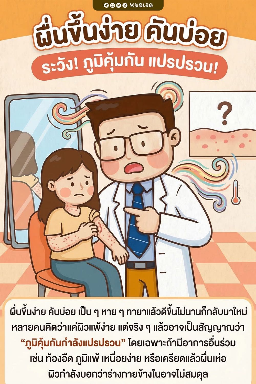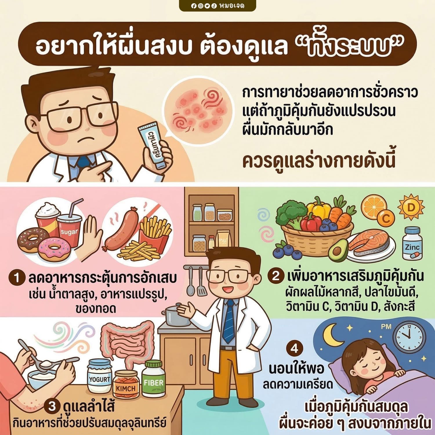 การมีผื่นคันเรื้อรังอาจไม่ใช่แค่ปัญหาผิว แต่เป็นสัญญาณว่าภูมิคุ้มกันกำลังเสียสมดุล ถ้าแก้แค่ปลายเหตุ อาการจะวนกลับมาเสมอ แต่ถ้าปรับอาหาร ดูแลลำไส้ เสริมสารอาหารที่จำเป็น พักผ่อนพอ และลดความเครียด ภูมิจะค่อย ๆ แข็งแรงขึ้น ผื่นจะสงบจากภายใน ไม่ใช่แค่ดีขึ้นชั่วคราวครับ