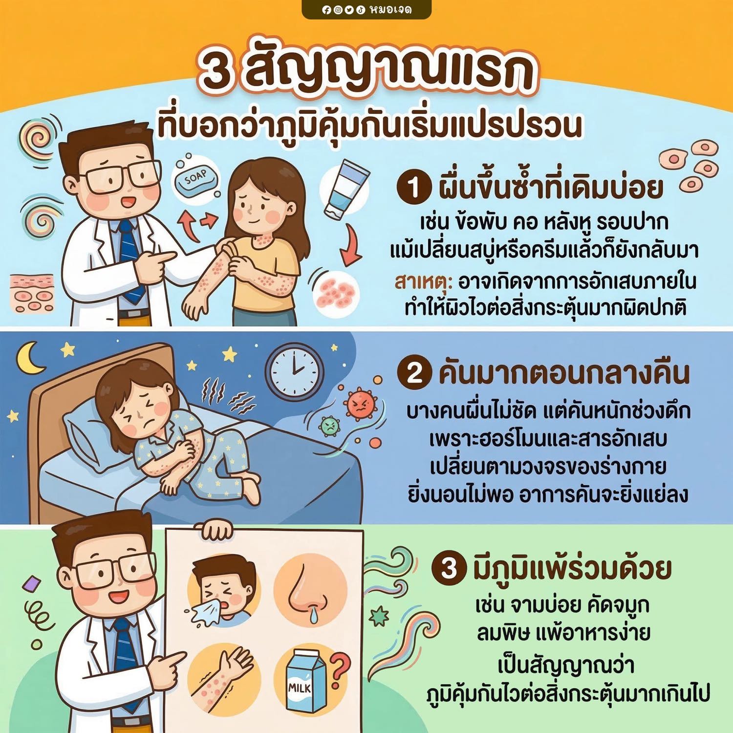 จาม คัดจมูก น้ำมูกใส ลมพิษ หรือแพ้อาหารง่าย เป็นสัญญาณว่าระบบภูมิคุ้มกันไวต่อสิ่งกระตุ้นมากเกินไป ผิวหนังมักเป็นอวัยวะที่แสดงอาการร่วม เพราะเกี่ยวข้องกับเซลล์ภูมิหลายชนิด หากภูมิแปรปรวนจากลำไส้ เครียด หรือพักผ่อนไม่พอ ผื่นและอาการแพ้จะกำเริบพร้อมกันได้บ่อย