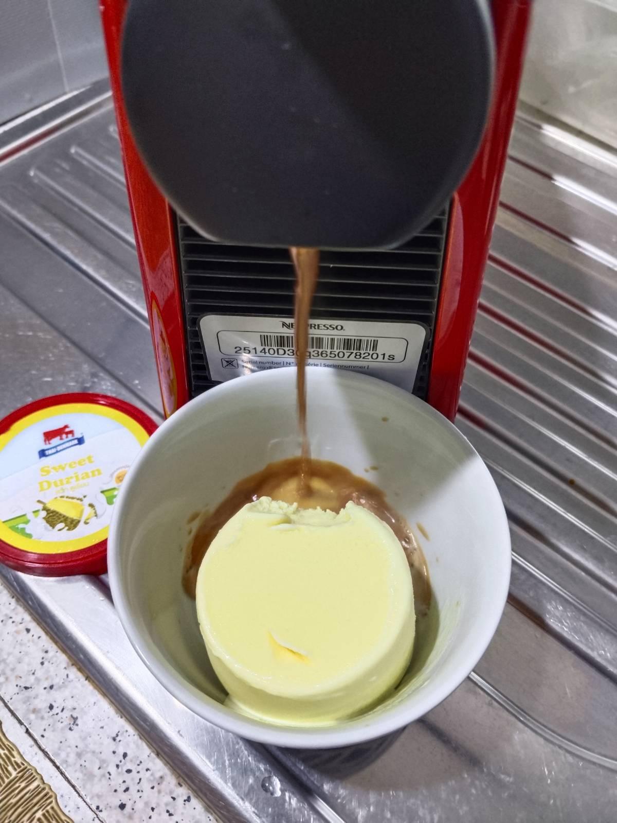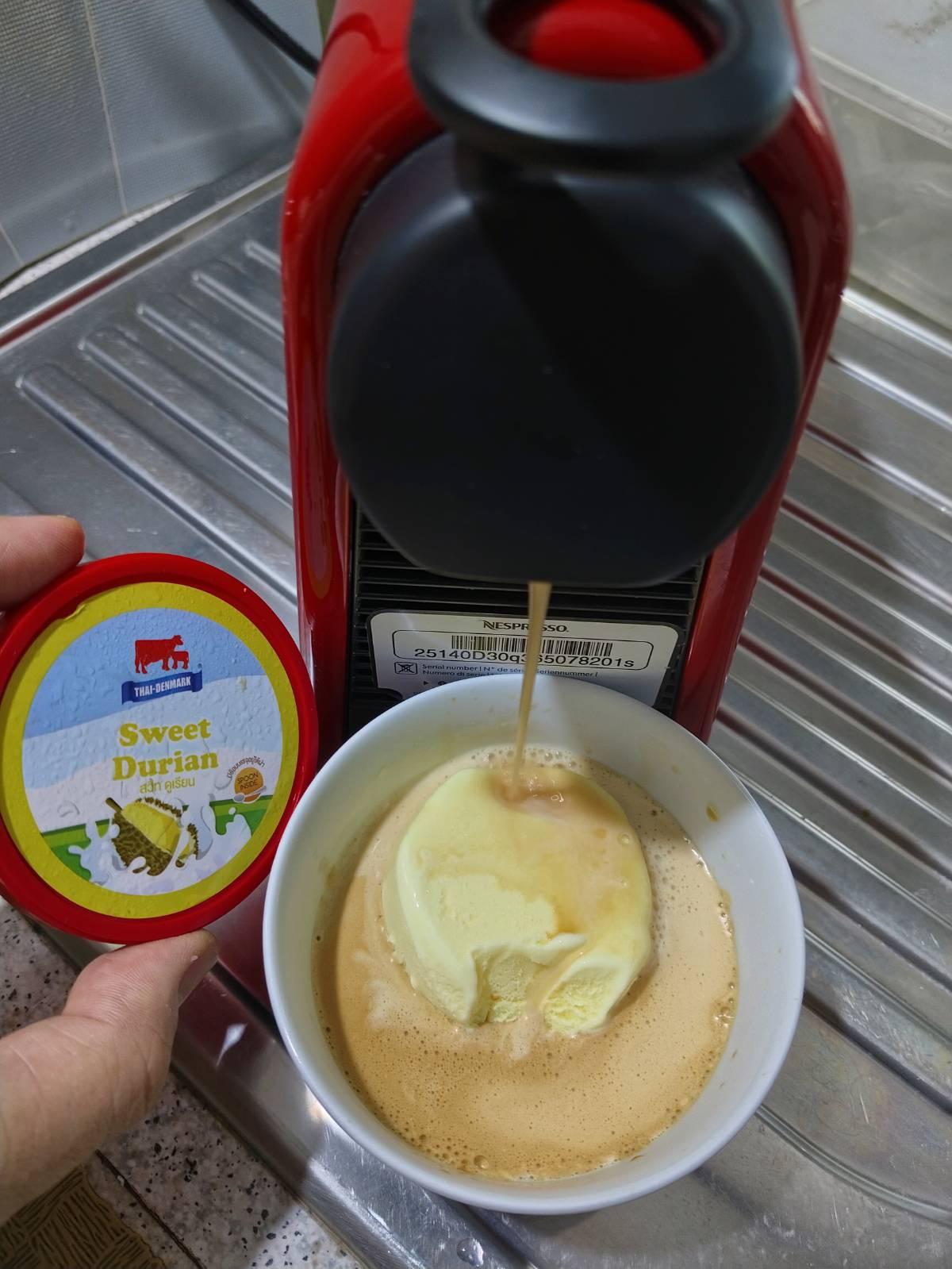 หวานแต่เช้าด้วย อัฟโฟกาโต้ กลิ่นวานิลลา ทุเรียนครับ หวานมันอร่อยกลมกล่อม ทานกับ ฮาวายไดนากอนเบรด ไส้ถั่วแดง
