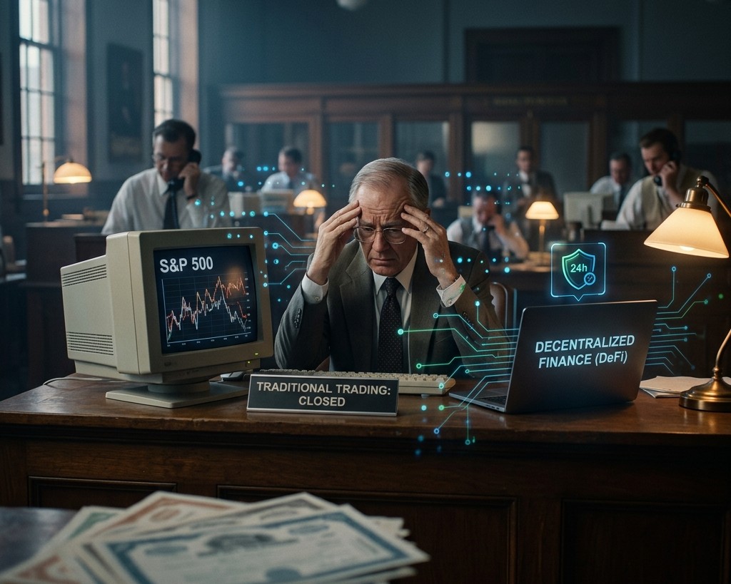 1. ตลาดสดดั้งเดิม (TradFi) คือตลาดหุ้น S&P 500 (รวมบริษัทใหญ่ที่สุดในอเมริกา 500 แห่ง) ตลาดนี้รวยมาก แต่นิสัยเสียคือ เปิด-ปิดเป็นเวลา, กฎระเบียบเยอะ, แถมมี "ตัวกลาง" คอยเก็บค่าธรรมเนียมยุ่บยั่บไปหมด