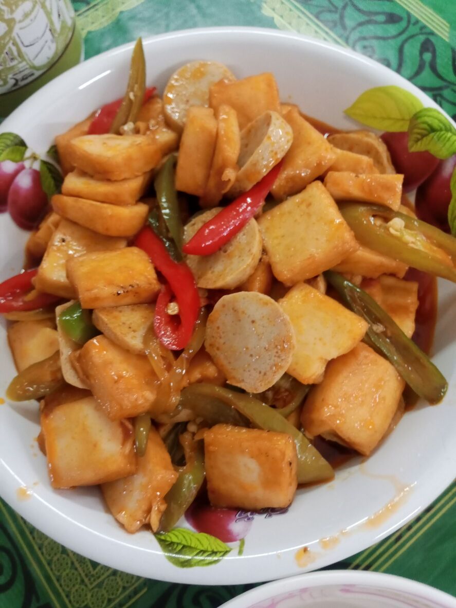 ผัดเปรี้ยวหวานเต้าหู้ปลา และลูกชิ้นที่ซื้อมายังอยู่ ก็หั่นใส่ลงไป