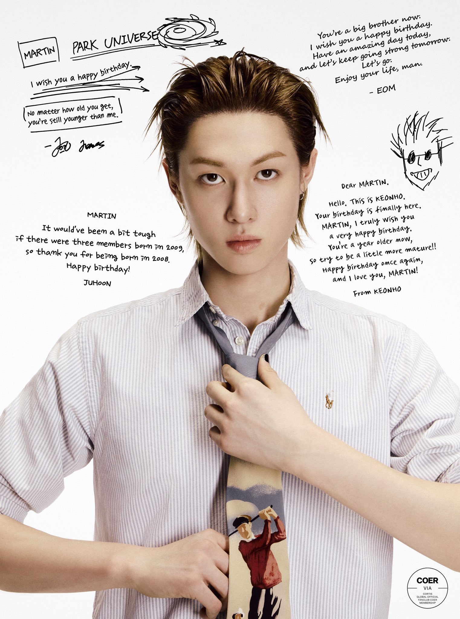 น้องกอนโฮ : มาร์ติน ผมขอให้นายมีความสุขมาก ๆ ในวันเกิด ตอนนี้นายอายุมากขึ้นอีกปีแล้ว งั้นก็พยายามโตขึ้นอีกนิดนะ! ผมรักนายนะมาร์ติน