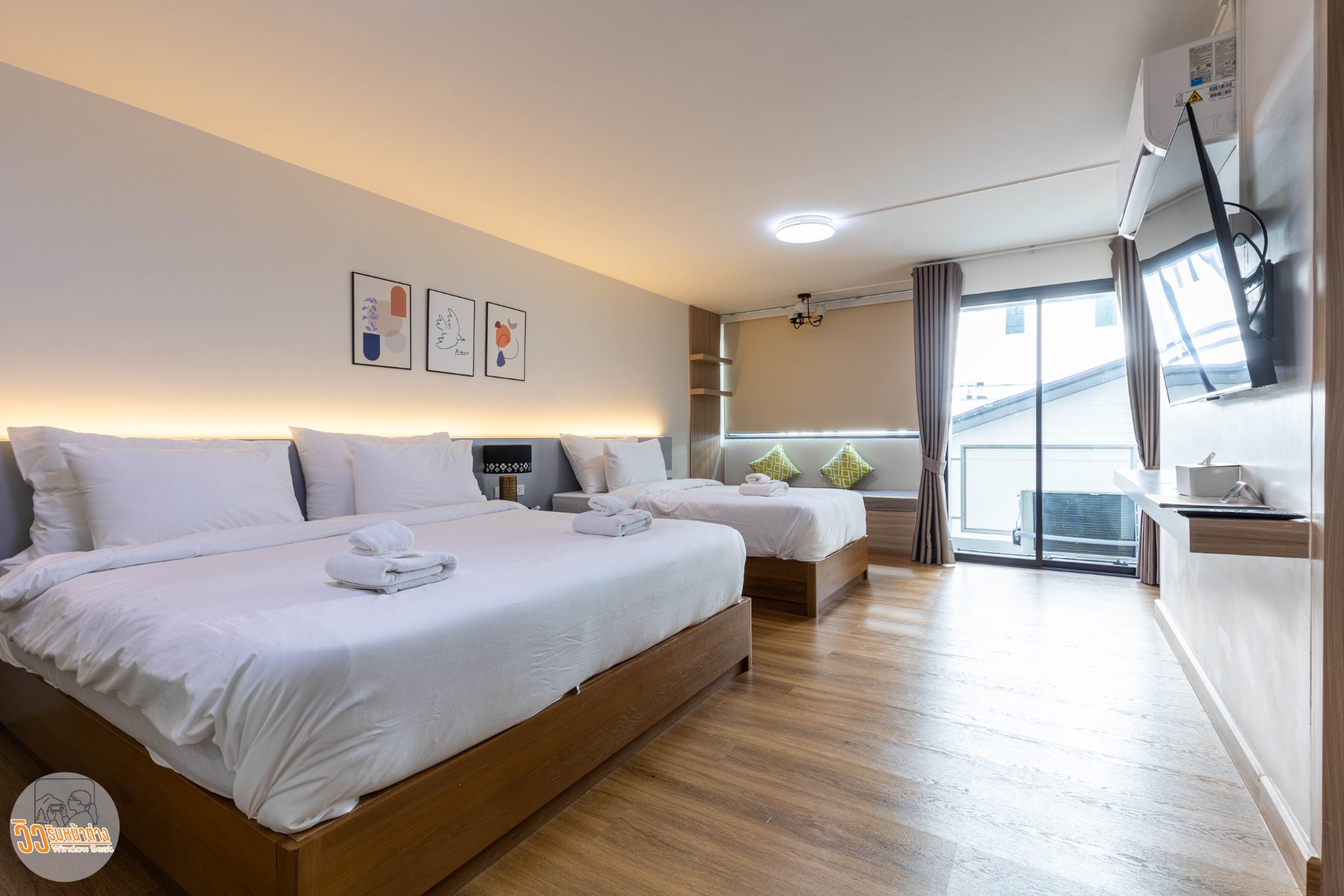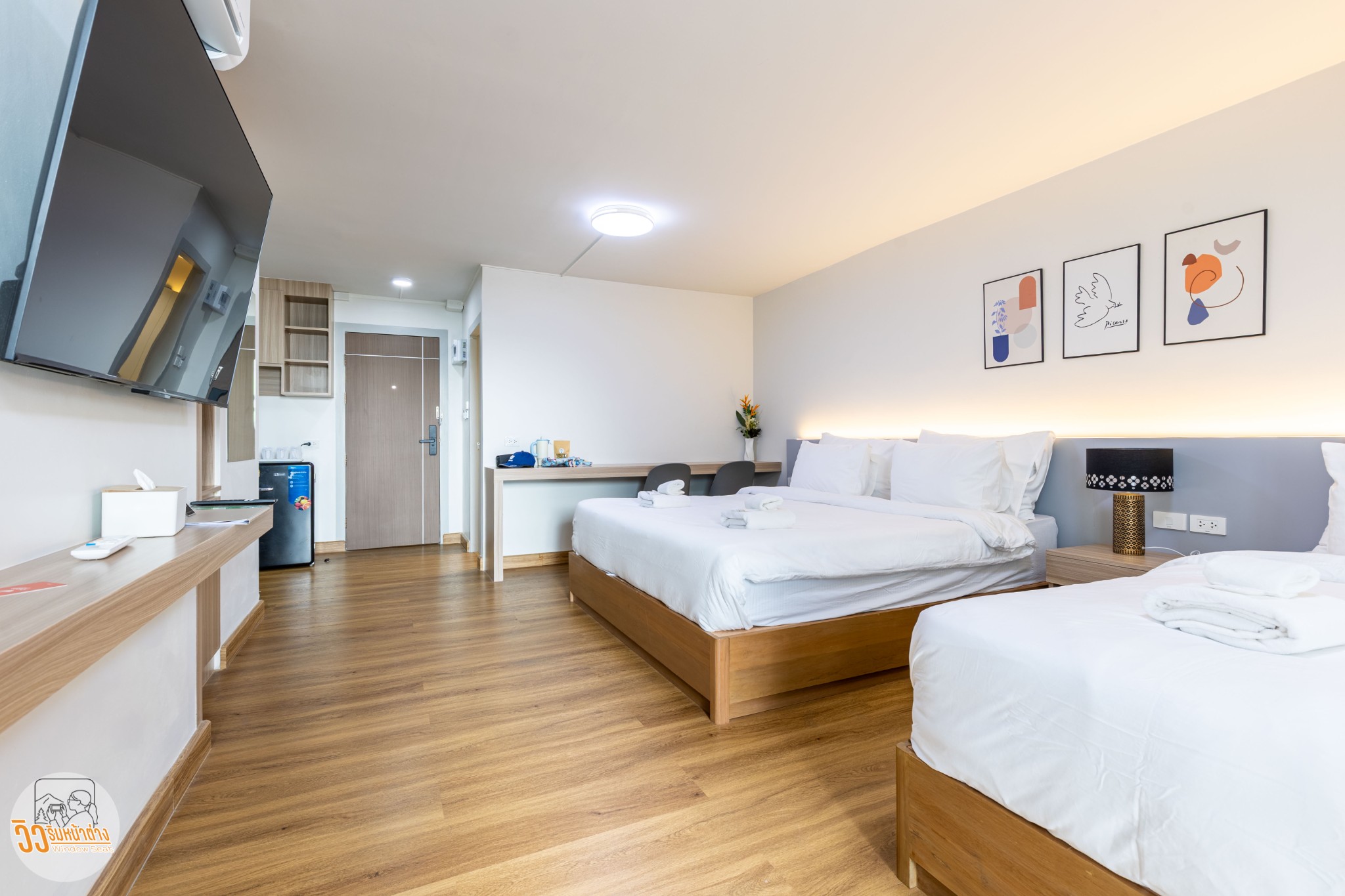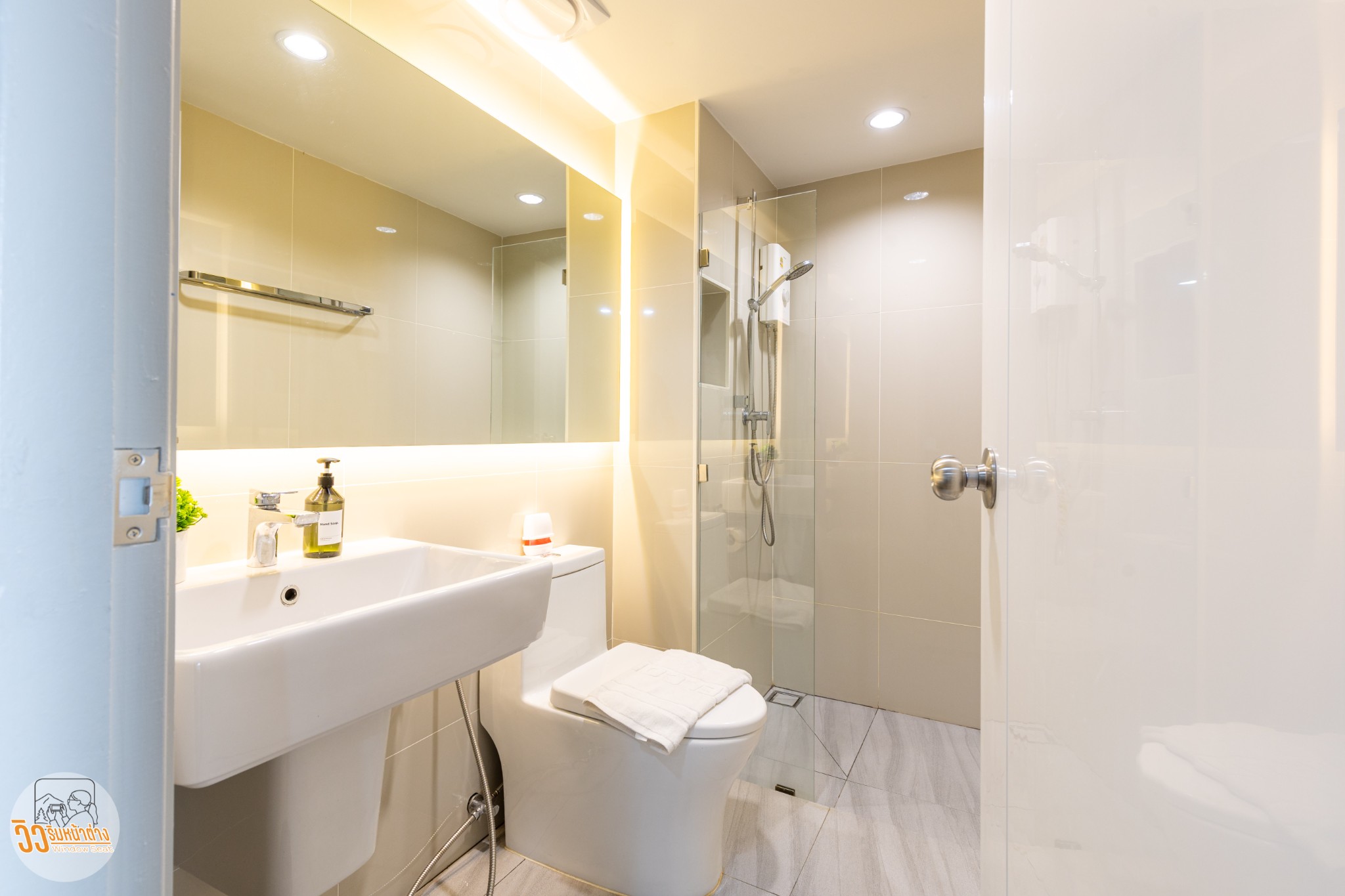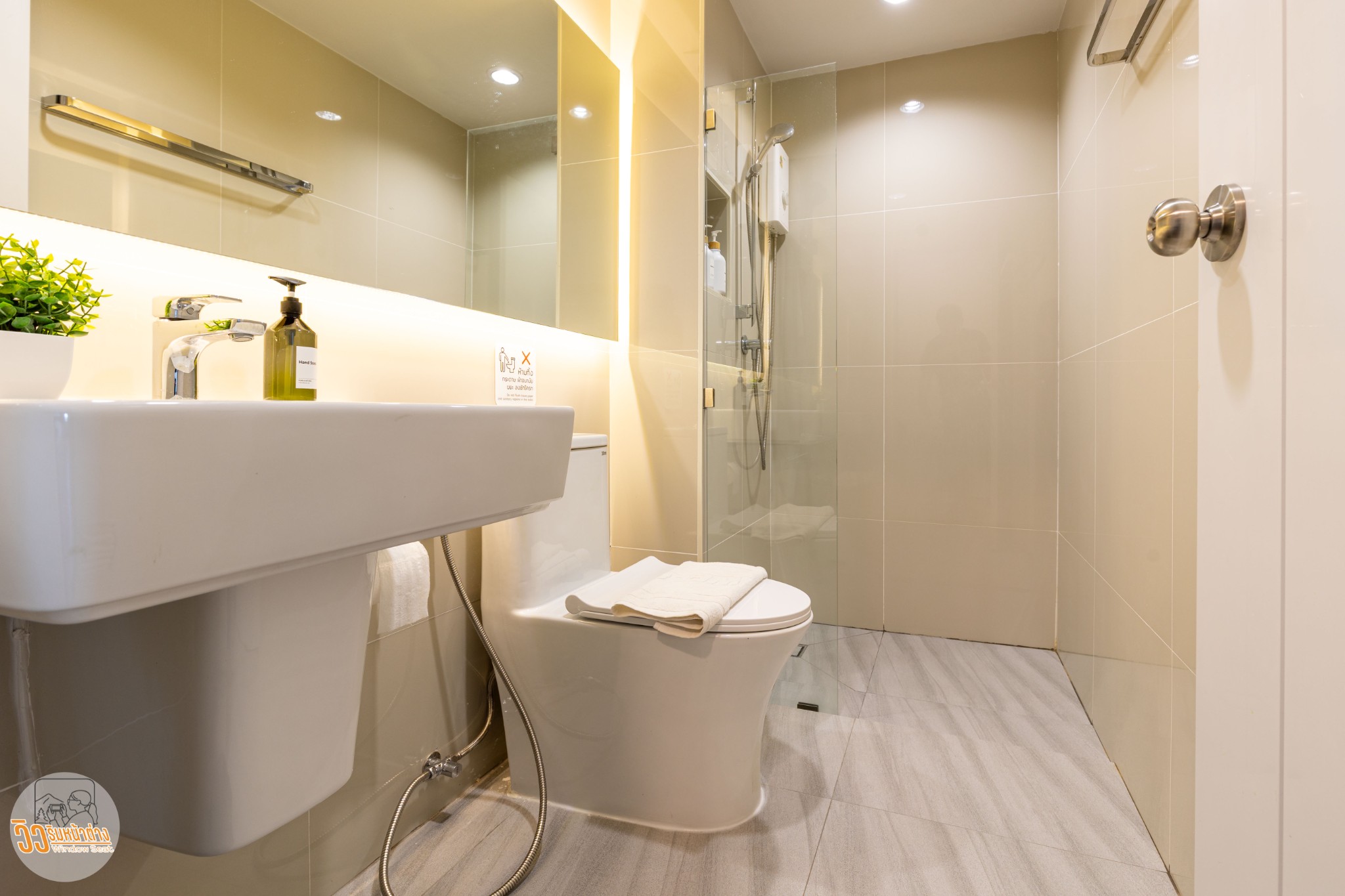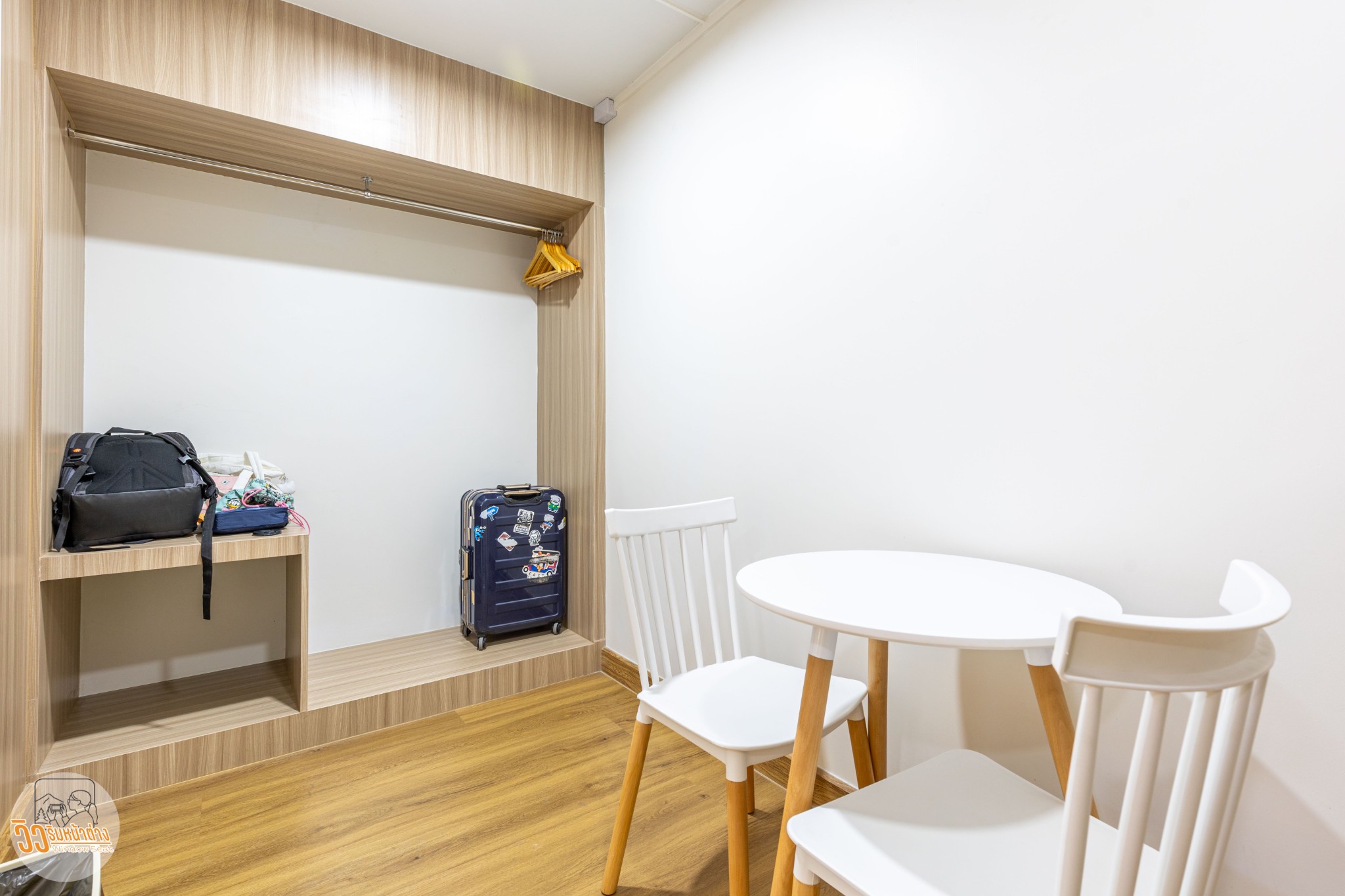 ห้องที่พักอีกห้องเป็นห้องสองเตียงแต่นอนได้สามคน เตียงใหญ่หนึ่งเตียง เตียงเล็กหนึ่งเตียง เหมาะมากสำหรับนอนสองคนแล้วดันนอนดิ้นทั้งคู่ เตียงเล็กก็ไม่ได้เล็กจนนอนลำบาก ภรรยาผมไปนอนเตียงเล็กนั่นแหละ ผมเลยครองเตียงใหญ่กางแขนกางขาสบายเลย ห้องแบบนี้มีส่วนนั่งทานข้าว อ่างล้างจานและตู้เสื้อผ้าที่แยกส่วนเพิ่มเติม ทำให้พื้นที่ของห้องใหญ่ขึ้นอีกหน่อยและใช้ชีวิตได้สบายขึ้น ถ้ามาพักยาวห้องนี้สบายกว่า ส่วนห้องน้ำเหมือนกับห้องตะกี้เปี๊ยบ