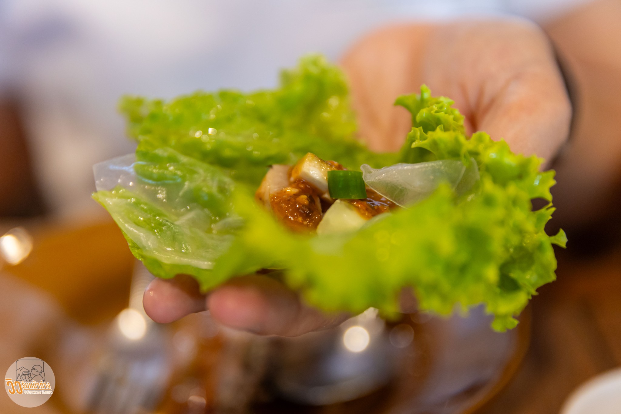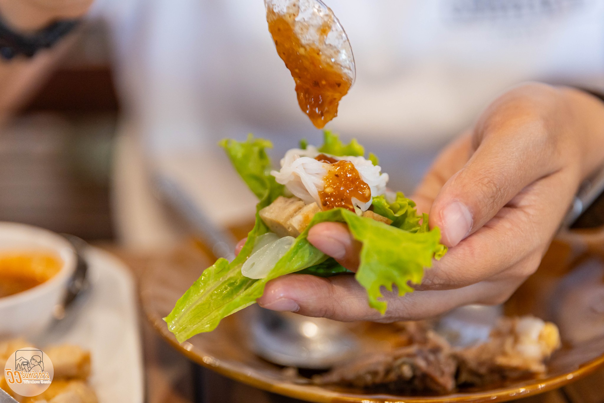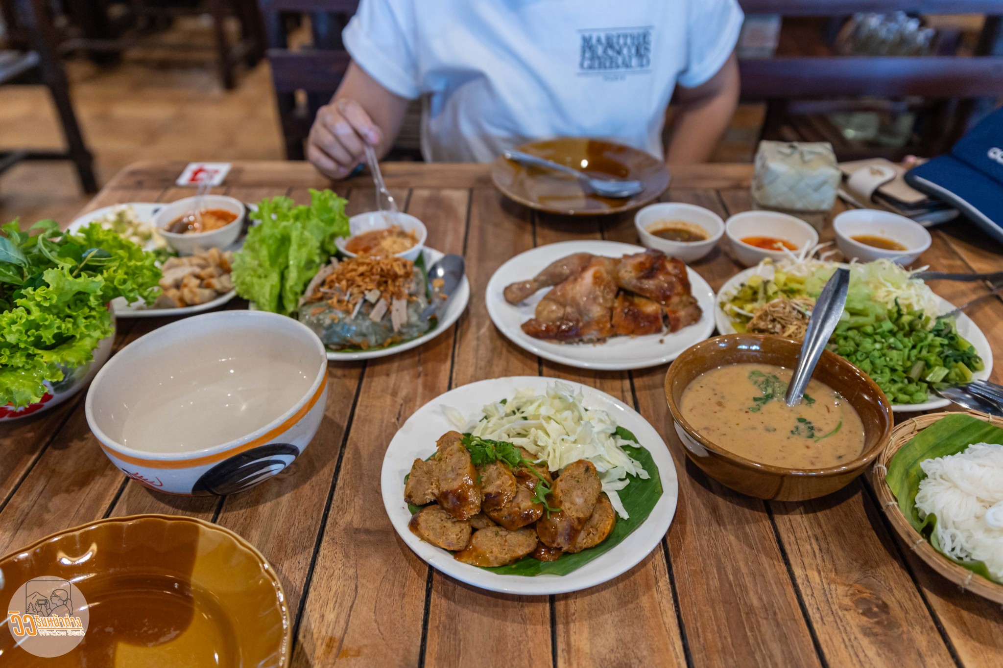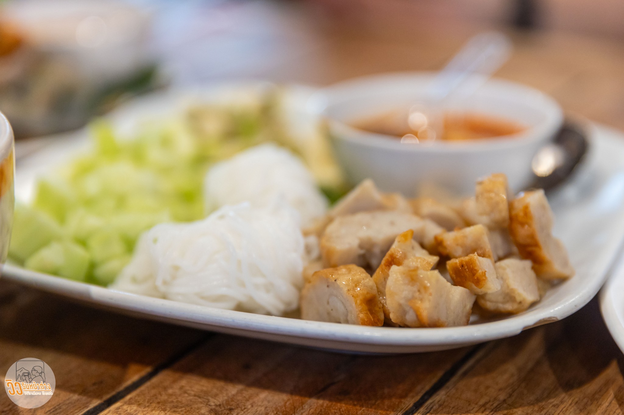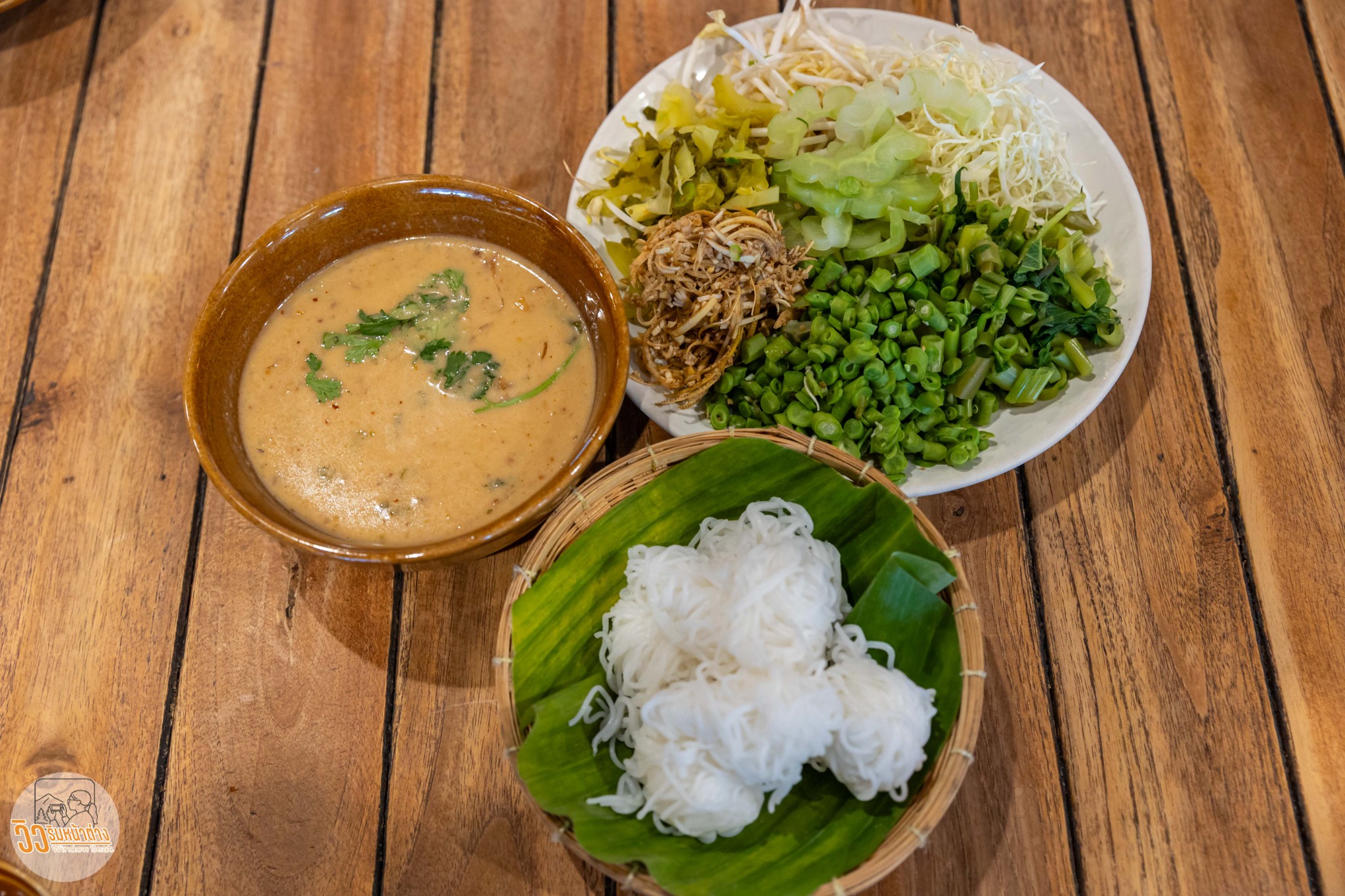 นั่งรอสักพักอาหารก็มาลงที่โต๊ะ เต็มโต๊ะเลยเริ่มตรงไหนก่อนดี เอาอาหารขึ้นชื่อเขาแล้วกันครับ “ขนมจีน” ผมสั่งเป็นขนมจีนน้ำพริก รสชาติของน้ำพริกค่อนข้างอ่อน หวานนำและมีความนวลแต่โดยรวมแล้วออกจะอ่อนไปหน่อยสำหรับผม ส่วนผักที่ให้มานั้นเสียเงินนะครับ และพนักงานจะเอามาวางให้ตั้งแต่นั่งลงที่โต๊ะเลย ยังไม่ทันสั่งอะไรก็มีผักทานเลย สงสัยร้านอยากให้เราได้ไฟเบอร์