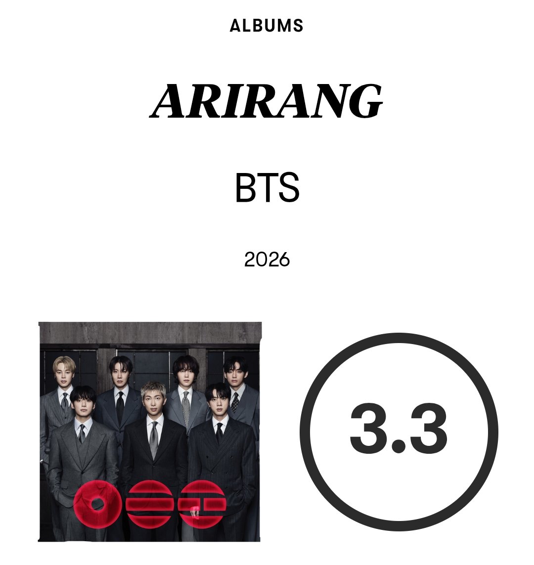 แต่โดยภาพรวมทุกคนเห็นตรงกันหมดว่าการให้คะแนนถูกต้องที่สุดแล้ว อัลบั้ม ARIRANG มันแย่จริงๆ น่าจะแย่ที่สุดในทุกอัลบั้มของ BTS เลยก็ว่าได้