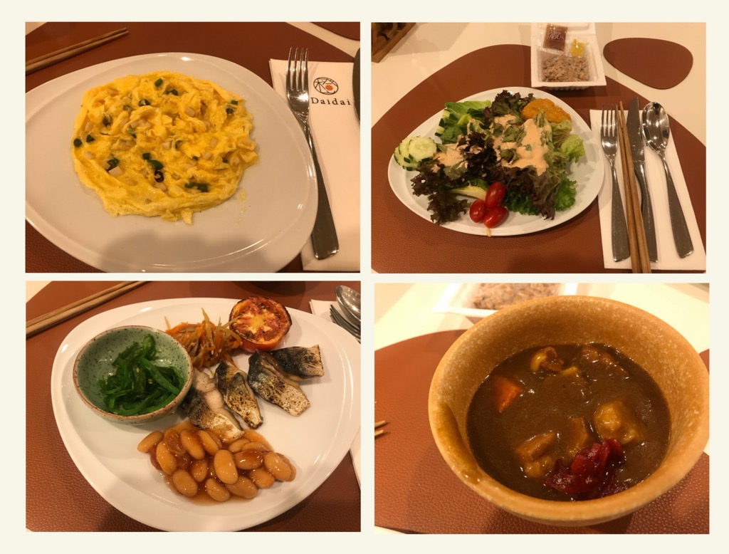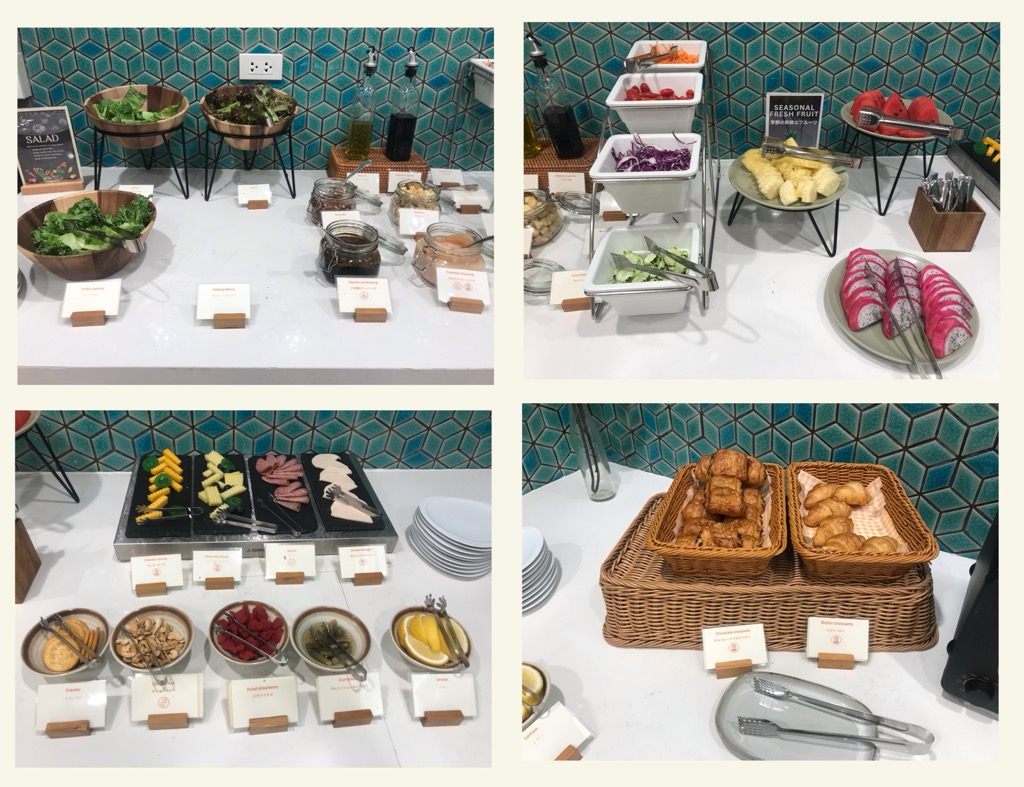 เริ่มจากไลน์อาหาร มุมอาหารประเภทสลัด และผลไม้ มีเดรสซิงสลัดให้หลายแบบ ที่ขาดไม่ได้คือ เดรสซิงงาแบบญี่ปุ่น ผลไม้มีสับปะรด แตงโต แก้วมังกร