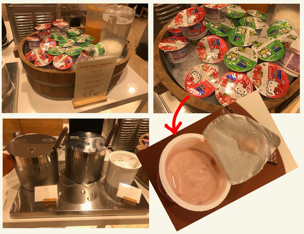 โยเกิร์ตครับ มีแบบโยเกิร์ตแบบพื้น (นมล้วน) และกระปุกสีแดงรูปฮัลโหลคิตตี้ เป็นรสสตรอว์เบอรี กระปุกสีเขียวรูปเคโระ เป็นรสมะพร้าว