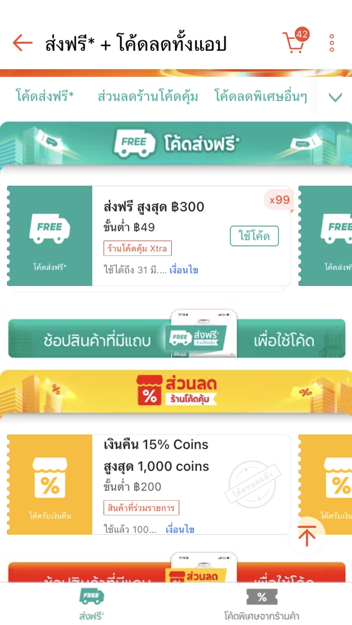 ปกติเราต้องสั่งของใช้โค้ดส่งฟรีเกือบจะทุกวันค่ะ แต่ตอนนี้ไม่มีโค้ดส่งฟรีให้เก็บเลย หายไปหลายอาทิตย์แล้ว มีแต่คูปองส่วนลดที่ใช้ไม่ค่อยได้เพราะตั้งยอดซื้อขั้นต่ำไ