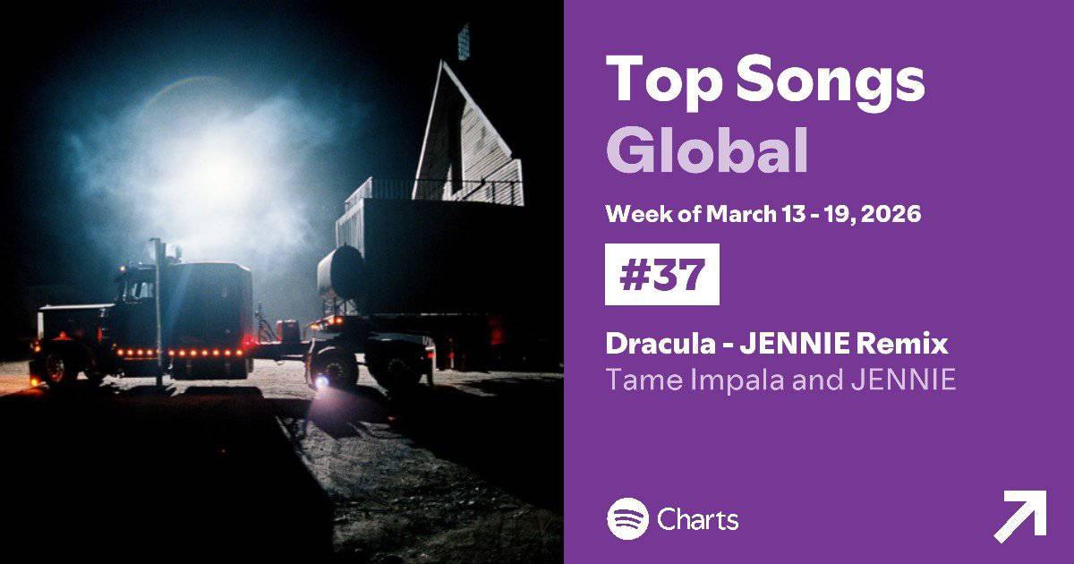 เพลง ‘Dracula’ (Remix) โดย Tame Impala และ JENNIE ขึ้นสู่อันดับสูงสุดใหม่ที่อันดับ #29 บนชาร์ต Spotify ทั่วโลก ด้วยยอดสตรีม 2.4 ล้านครั้ง