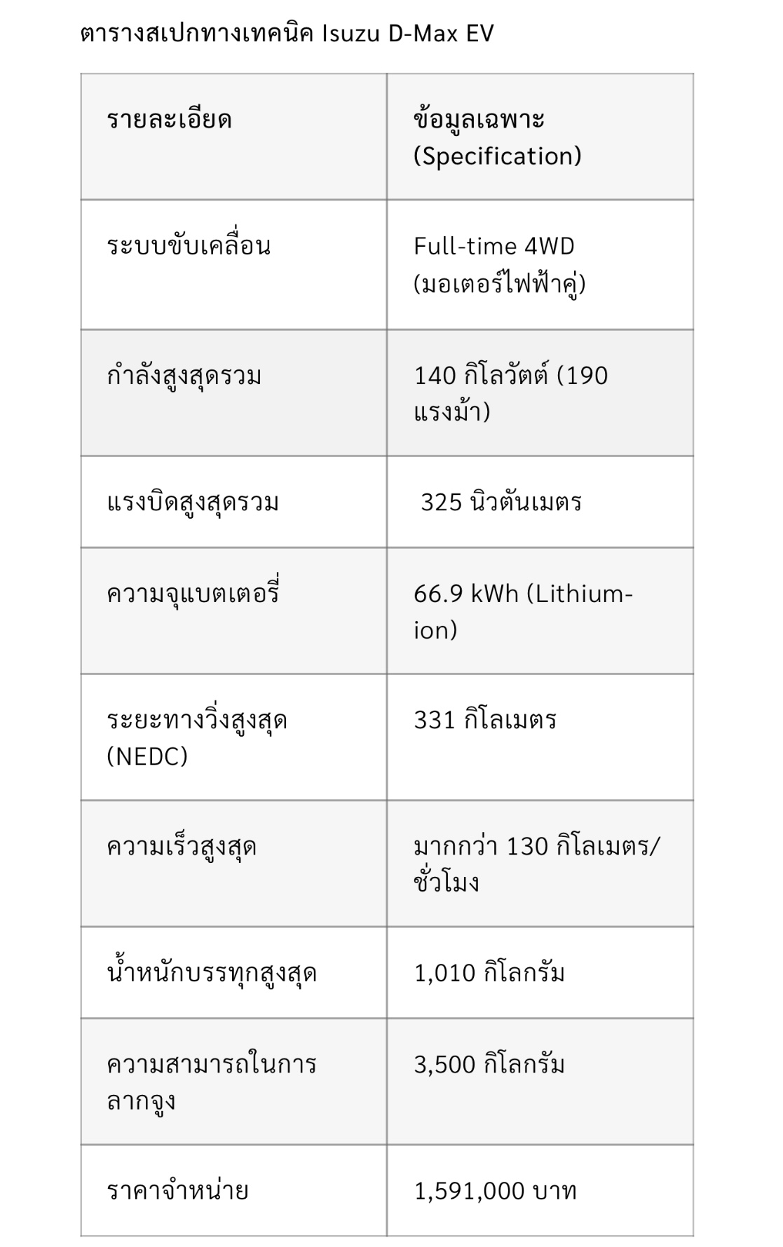 Isuzu D-Max EV ราคา 1.59 ล้านบาท กระบะไฟฟ้า 4WD มอเตอร์คู่
