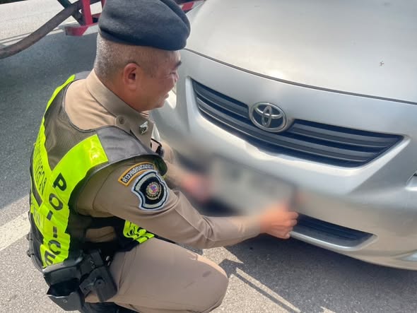 จากการตรวจสอบ พบว่าป้ายทะเบียนและป้ายภาษีที่ติดมากับรถเป็นของปลอม และข้อมูลไม่ตรงกับตัวรถจริง ลักษณะเป็นการทำ “รถแฝด” เพื่อหลีกเลี่ยงความผิดทางกฎหมาย