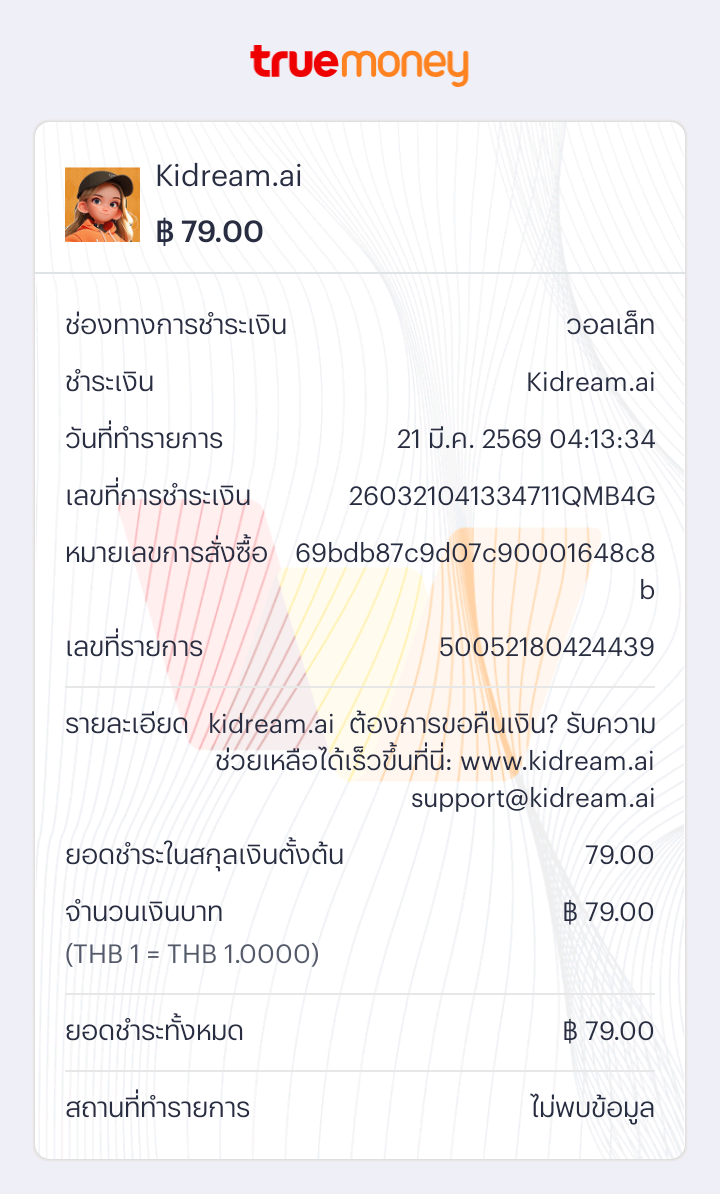 ผมเคยเห็นแอป Kidream ที่โฆษณาว่าหาเงินได้ จึงลองทดสอบดูว่าโอนเงินออกมาจริงหรือไม่ ผมได้รับบัตรกำนัลมาแล้ว แต่ก็ถูกหักค่าใช้จ่ายไป 79 บาทผมจึงเข้าไปขอคืนเงินที่เว็บไซต์ kidream.ai ใส่หมายเลขคำสั่งซื้อ