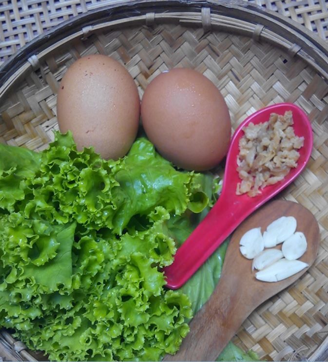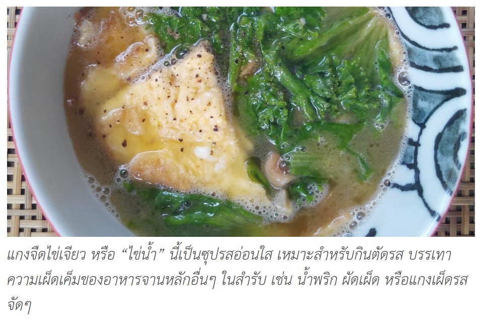 แกงจืดไข่เจียวแบบสูตรดั้งเดิม มีแค่ไข่จริง ๆ เจียวให้ฟูกรอบ แล้วจึงทำน้ำซุปกระเทียมในกระทะเดียวกันนั้นเอง ใส่ผักกาดหอมเพียงอย่างเดียว อนึ่ง การใช้ผักกาดหอมในอาหารไทย (ซึ่งเดิมน่าจะได้รับอิทธิพลจากกับข้าวจีน) ปัจจุบันดูจะลดน้อยลงมากแล้ว