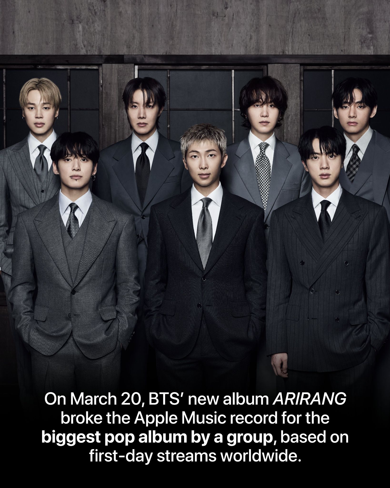 🍎 Apple Music ประกาศ 'ARIRANG' ของวง BTS ทำลายสถิติ "อัลบั้มป๊อป" ที่มียอดสตรีมสูงสุดในวันแรกทั่วโลกโดยศิลปินกลุ่ม