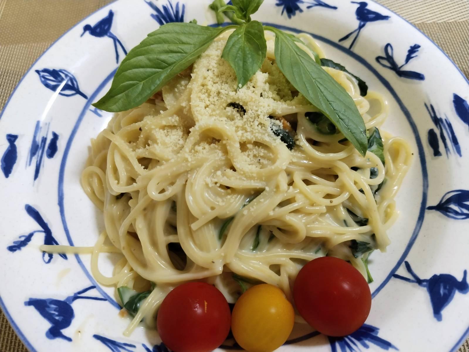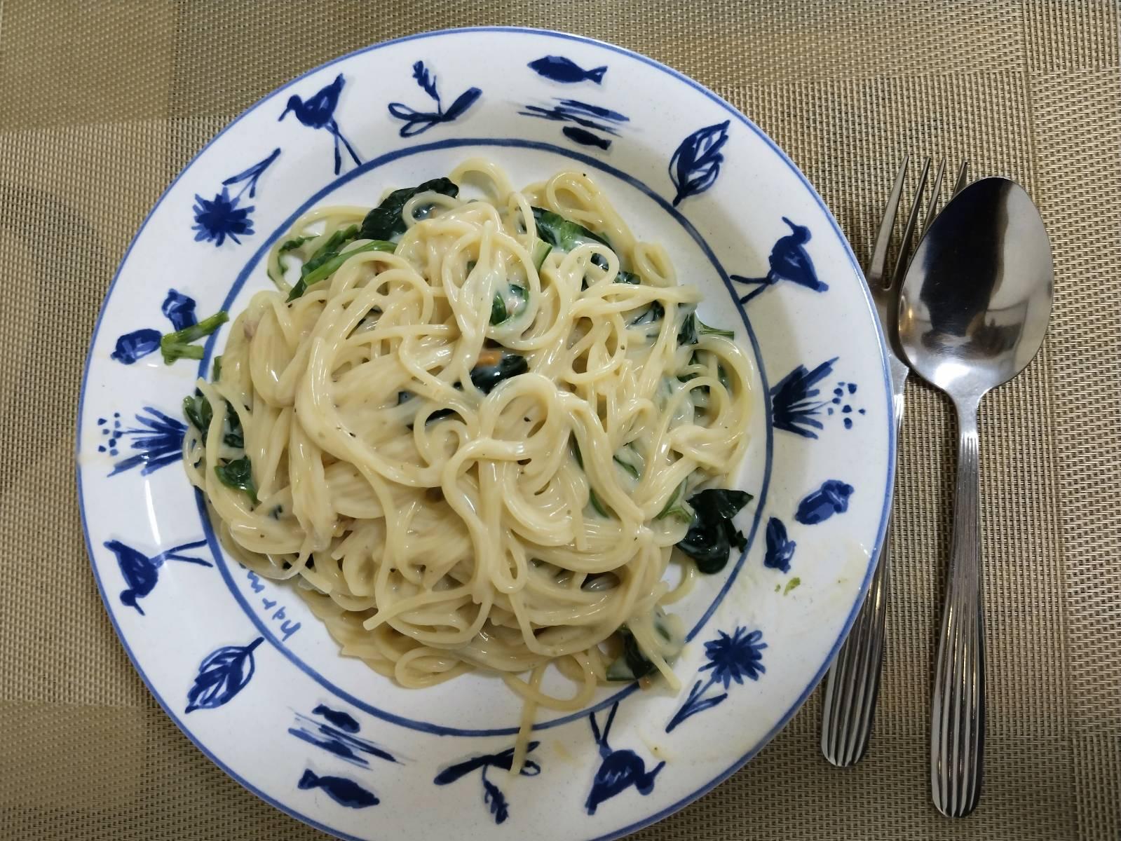 เทนมสด ราดซอสสำเร็จรูป อุ่นจนร้อน ใส่ผักโขม เสร็จพร้อมทาน