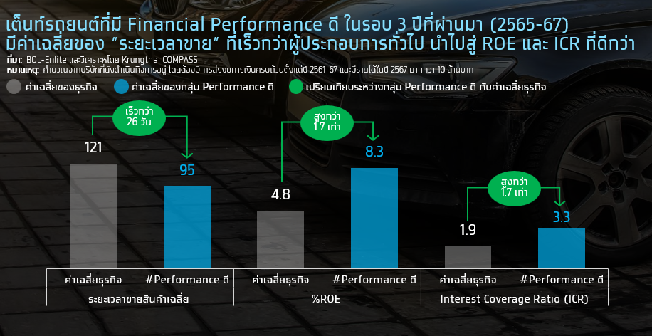เต็นท์รถที่มีผลการดำเนินงานโดดเด่นสามารถขายรถได้เฉลี่ยภายใน 95 วัน เร็วกว่าค่าเฉลี่ยของธุรกิจที่ใช้เวลาประมาณ 121 วัน ความแตกต่างเพียงไม่กี่สัปดาห์นี้ส่งผลโดยตรงต่อความสามารถในการทำกำไร กลุ่มที่ขายรถได้เร็วมีอัตราผลตอบแทนต่อผู้ถือหุ้นเฉลี่ย 8.3% และมีความสามารถในการชำระดอกเบี้ย 3.3 เท่า สูงกว่าค่าเฉลี่ยธุรกิจที่อยู่ที่ 4.8% และ 1.9 เท่าตามลำดับ
