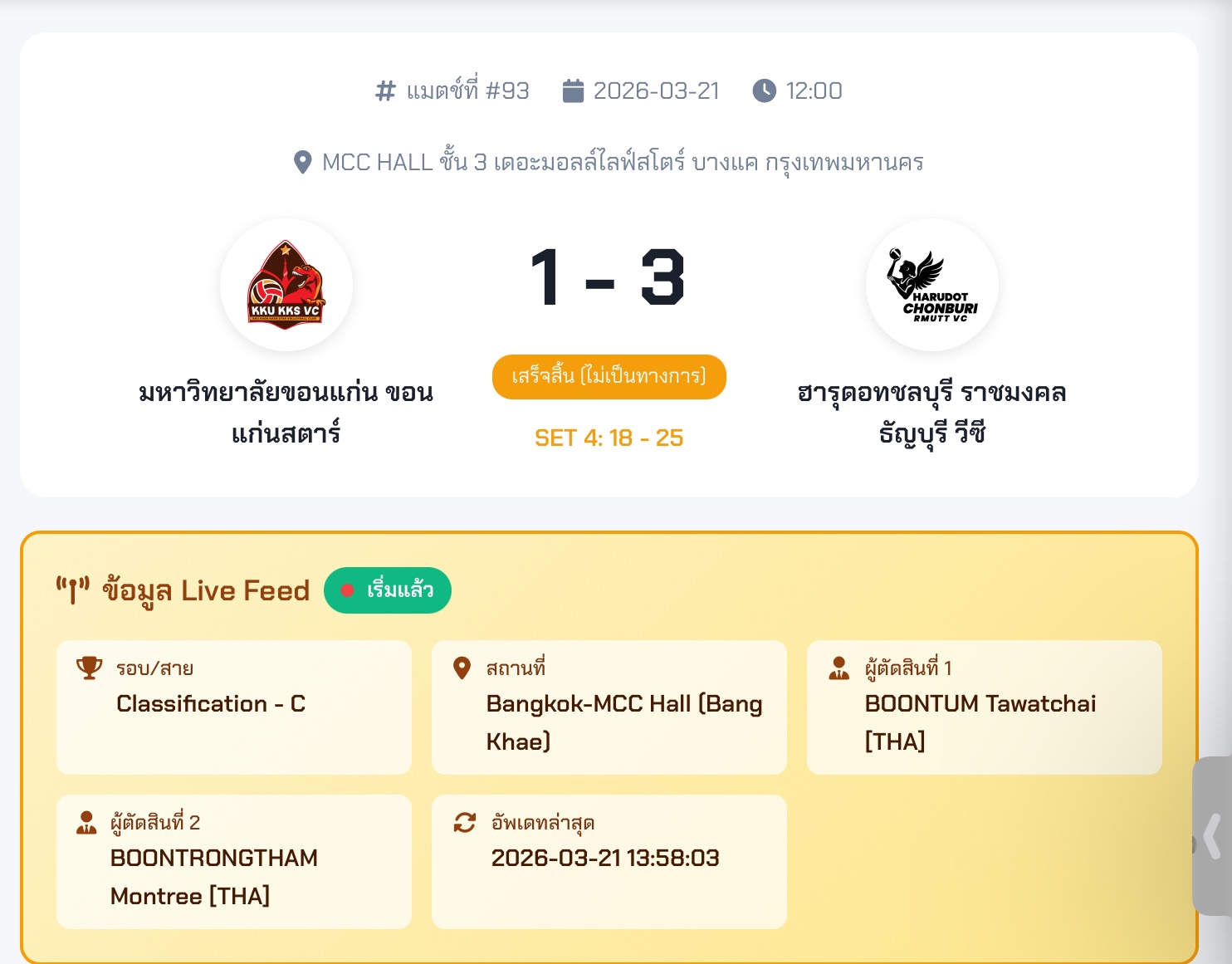 มหาวิทยาลัยขอนแก่น ขอนแก่นสตาร์ 1-3 ฮารุดอทชลบุรี ราชมงคลธัญบุรี วีซี (19-25 26-24 24-26 18-25)