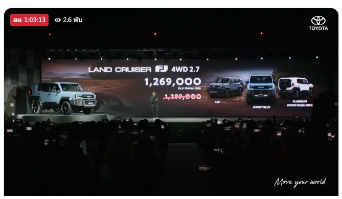 LAND CRUISER FJ 2.7 6AT 4WD 1,269,000 บาท ราคาพิเศษช่วงเปิดตัว จากปกติ 1,289,000 เหลือ 1,269,000 บาท วันนี้ – 31 สิงหาคม ชมรถคันจริงได้ที่งาน Motor Show 2026 ระหว่างวันที่ 25 มีนาคม – 5