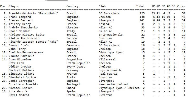 อันดับที่ 1 โรนัลดินโญ่ นักข่าวลงคะแนน 50 คน จาก 52 คน ถูกเลือกอันดับ 1 มี 33 คน อันดับ 2 มี 11 คน