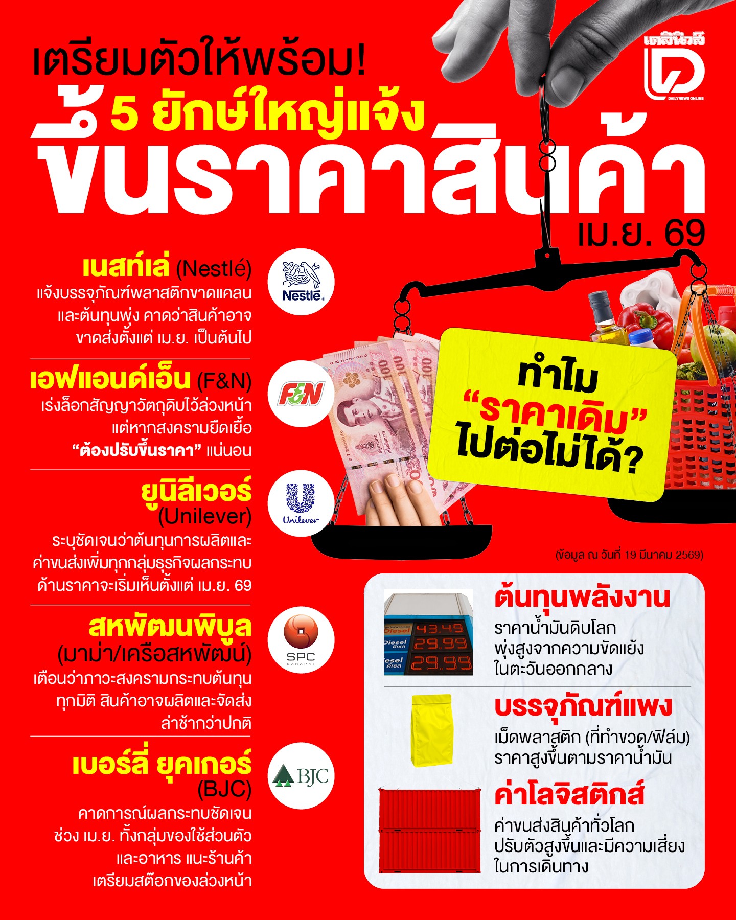 รัฐบาลเอาไม่อยู่! 5 ยักษ์ใหญ่สินค้าอุปโภคบริโภค ส่งหนังสือแจ้งร้านค้า เตือนราคาสินค้าพุ่งแน่เดือนเมษายน หลังพิษ #สงครามตะวันออกกลาง ฉุดต้นทุนวัตถุดิบ-บรรจุภัณฑ์ทะลุเพดาน