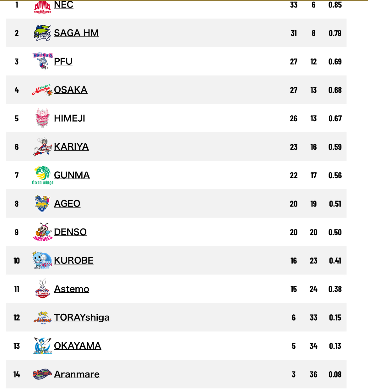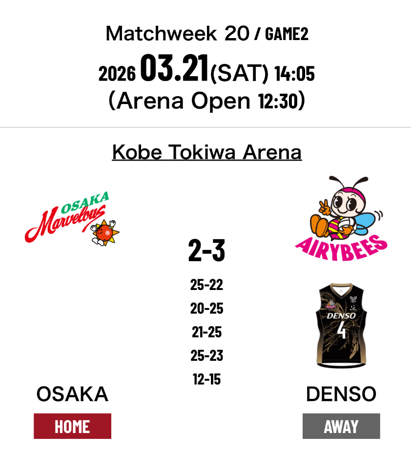 1.Osaka Marvelous 2-3 Denso Airybees (25-22 20-25 21-25 25-23 12-15)