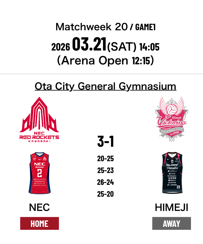 3.NEC Red Rockets Kawasaki 3-1 Victorina Himeji (20-25 25-23 26-24 25-20)