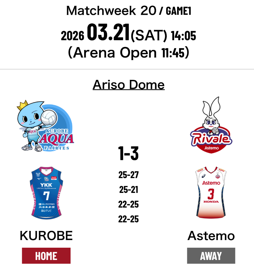 4.Kurobe Aqua Faries 1-3 Astemo Rivale Ibaraki (25-27 25-21 22-25 22-25)