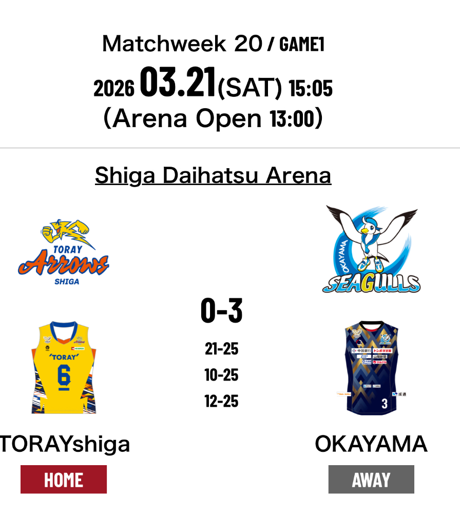 6.Toray Arrows Shiga 0-3 Okayama Seagulls (21-25 10-25 12-25)