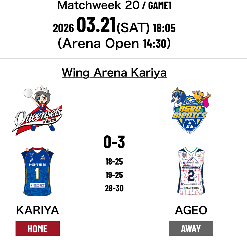7.Queenseis Kariya 0-3 Saitama Ageo Medics (18-25 19-25 28-30)