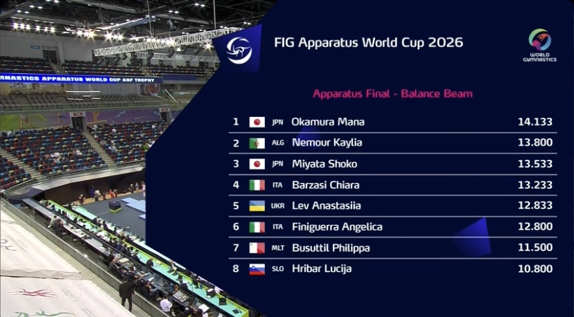 Mana Okamura นักยิมนาสติกหน้าใสตัวตึงของญี่ปุ่น โชว์ฟอร์มเยี่ยม คว้า 2 เหรียญทองในการแข่งขันยิมนาสติกสากลรายการ FIG World Cup 2026 ณ เมือง Baku ประเทศอาเซอร์ไบจาน เมื่อวันจันทร์ที่ 9 มีนาคม 2569 ที่ผ่านมา โดยเธอคว้า 2 เหรียญทองจากอุปกรณ์ประเภทคานทรงตัว และฟลอร์ เอ็กเซอร์ไซส์
