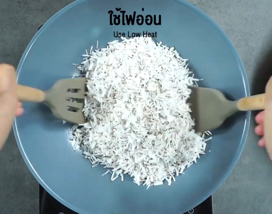 ๔. นำส่วนผสมที่ได้ใส่ลงในกะทะและใส่น้ำเล็กน้อย