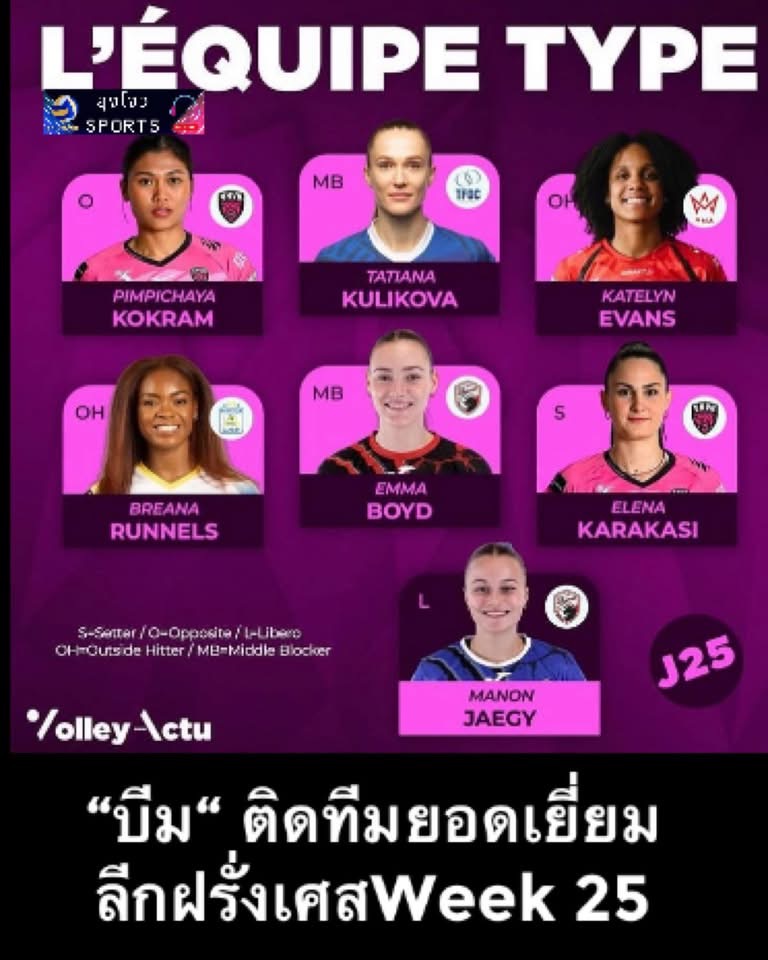ยินดีกับควีนบีม พิมพิชยา ก๊กรัมย์ด้วยค่ะ ติด1ใน7ผู้เล่นใทีมยอดเยี่ยม ลีกฝรั่งเศสสัปดาห์ที่25