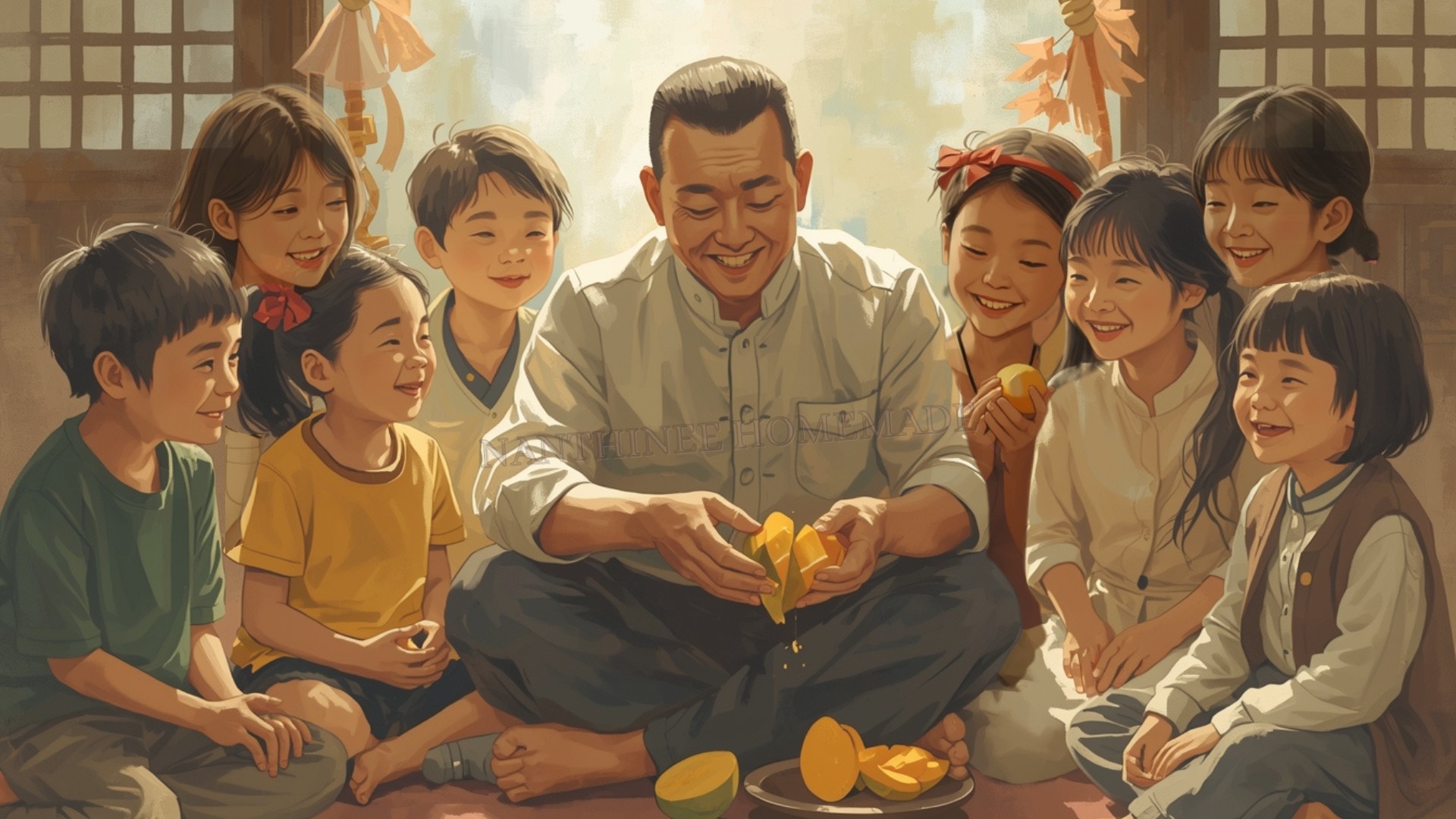 "วันนั้นอาป๊ะได้มะม่วงอกร่องมา อาป๊ะรีบเอาไปแช่น้ำในโอ่ง เพื่อให้มะม่วงได้รับความเย็นจากน้ำก่อนที่จะนำมาผ่าแล้วแจกให้ลูกๆได้กินกับข้าวสวย อาป๊ะจะผ่าครึ่งมะม่วงตามยาวทั้งสองด้าน แล้วสอนให้พวกเราค่อยๆแยกเปลือกออกจากเนื้อ กินมะม่วงแทนกับ พวกเรานั่งล้อมวงกัน อาป๊ะค่อยๆแจกมะม่วงวนให้พวกลูกๆ รอจนทุกคนกินหมด ก็จะผ่าแล้วแจกวนรอบใหม่ อาป๊ะจะแยกเมล็ดมะม่วงใส่จานไว้ต่างหาก ให้ลูกๆได้แทะเนื้อข้างๆเล่นจนกว่าลูกๆจะอิ่ม อาป๊ะจึงจะหยิบส่วนที่เหลือให้ตัวเอง"