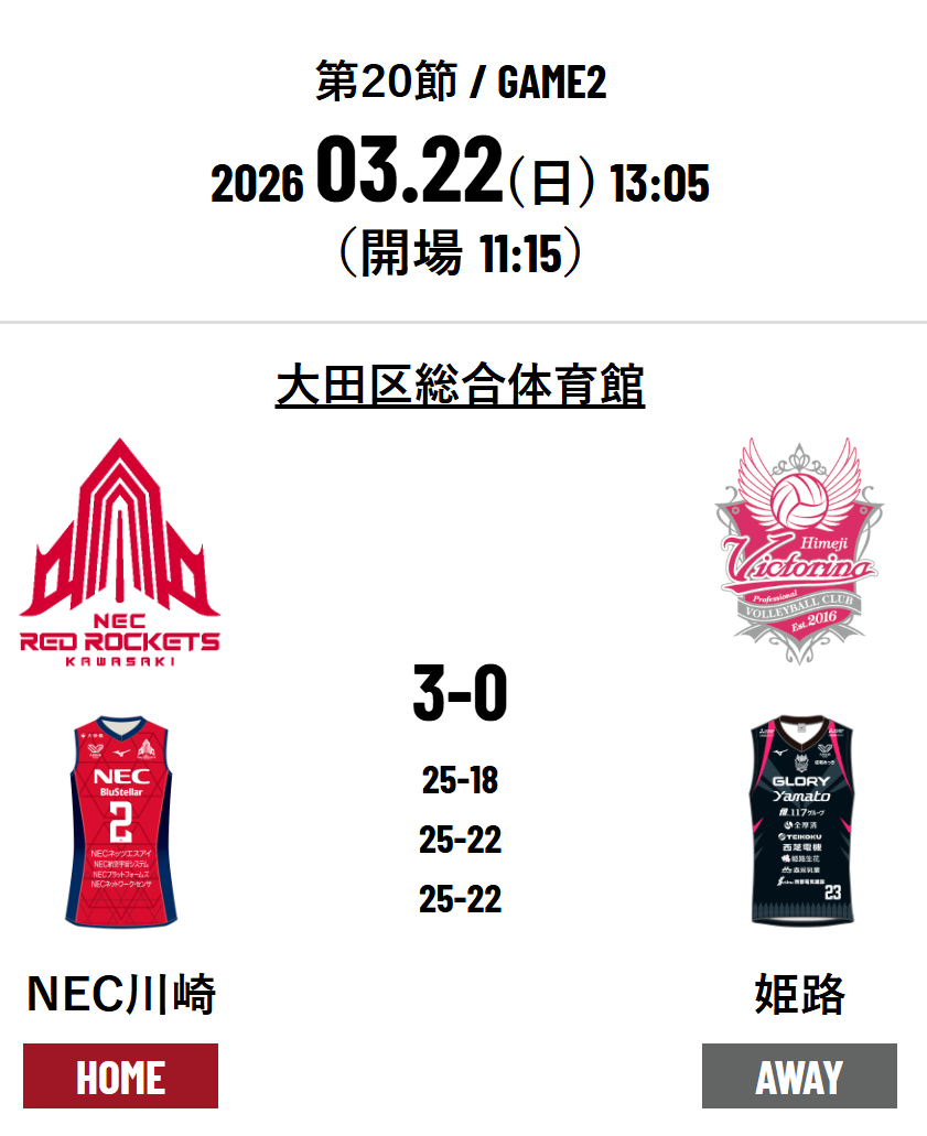 NEC Red Rockets Kawasaki 3 - 0 Victorina Himeji