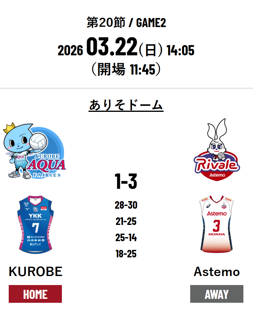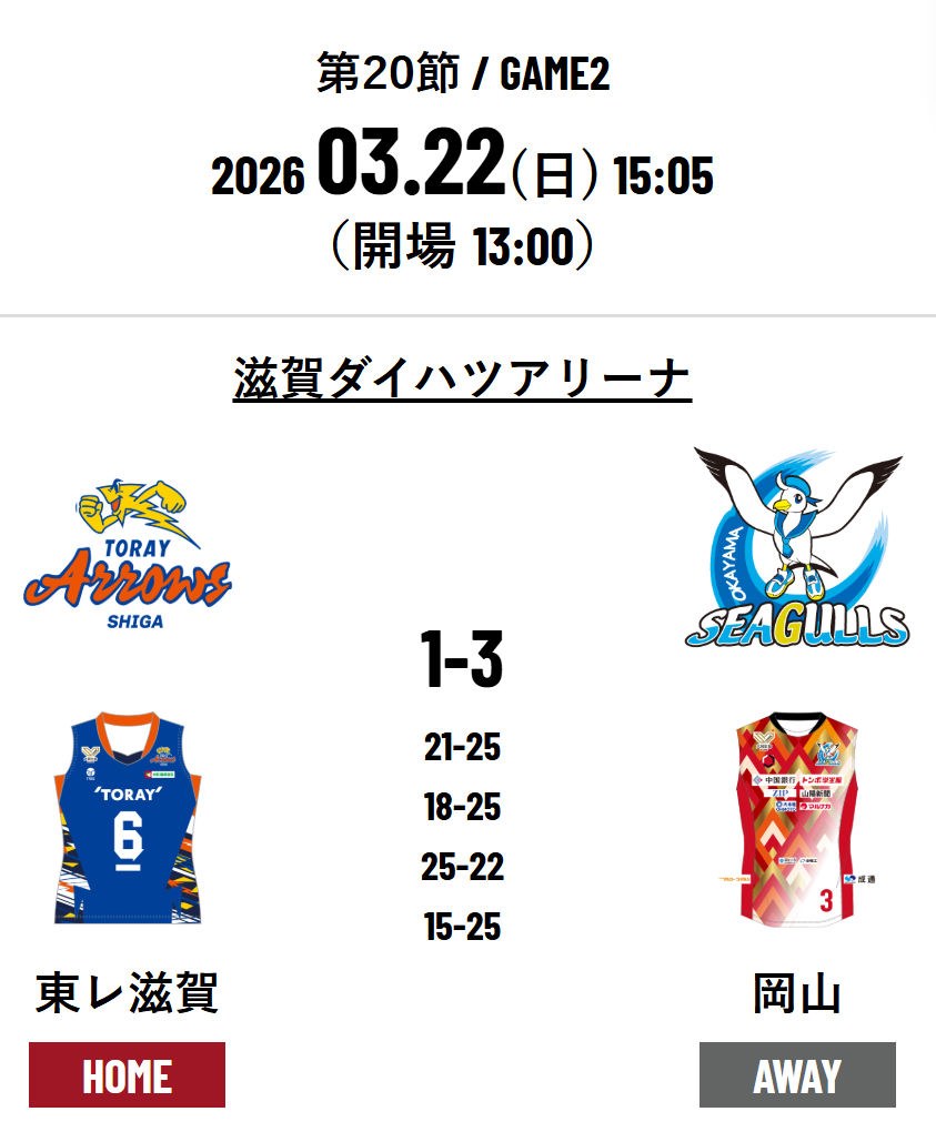 Toray Arrows Shiga 1 - 3 Okayama Seagulls