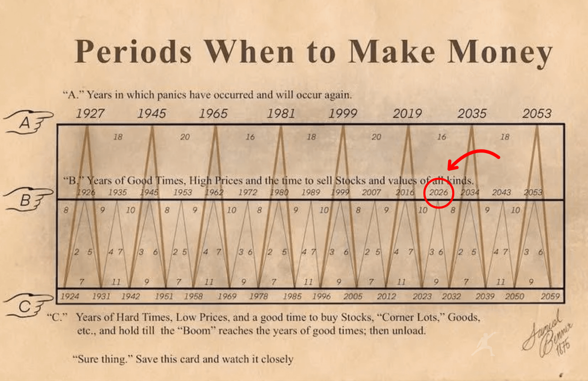 "Benner Cycle" หรือ "ตารางวัฏจักรเศรษฐกิจของ Samuel Benner" ซึ่งเป็นเกษตรกรชาวอเมริกันที่สร้างแผนภูมินี้ขึ้นในปี 1875 (พ.ศ. 2418) เพื่อพยากรณ์ราคาพืชผลและแนวโน้มเศรษฐกิจ