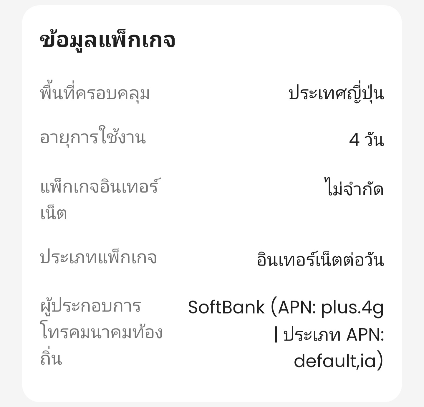 แพ็คเกจที่เราเลือกจาก Klook ราคา 177 บาท (เป็นราคาในวันที่ซื้อ) สำหรับใช้งาน 4 วัน อินเทอร์เน็ตไม่จำกัด โดยใช้เครือข่ายของ NTT Docomo ซึ่งเป็นหนึ่งในเครือข่ายมือถือที่ครอบคลุมทั่วญี่ปุ่น