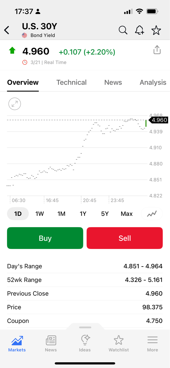 อัตราผลตอบแทนพันธบัตรรัฐบาลสหรัฐ 30 ปี (U.S. 30Y Yield) ขึ้นไปแตะ ~4.96% ซึ่งถือว่า “ใกล้ระดับสูงสำคัญ 5%”