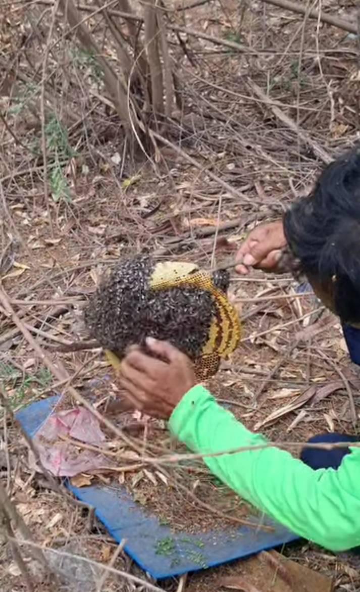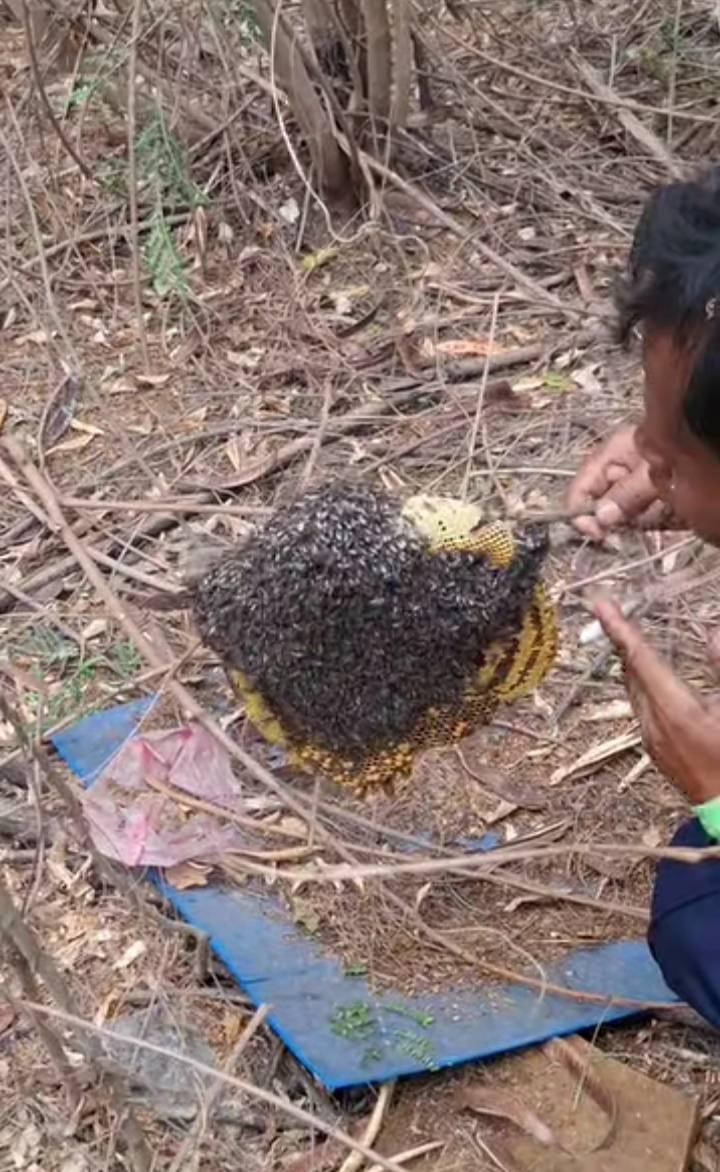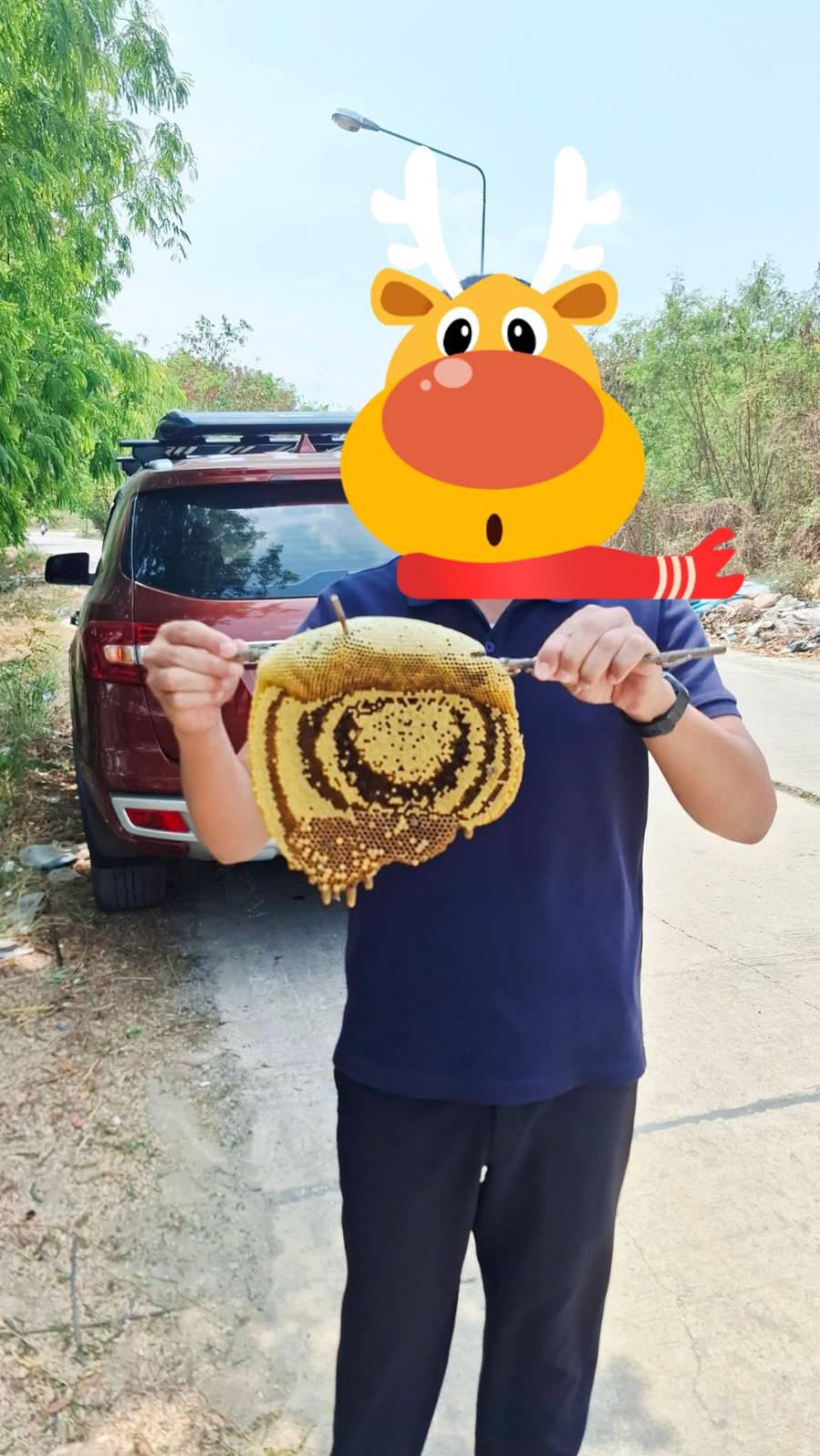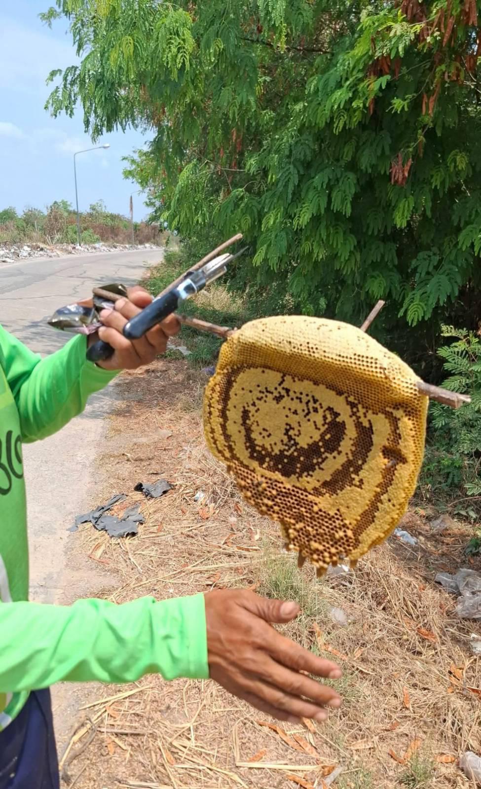 เพื่อนผมเอง หน่วยพ่นควัน แล้วเอามือปัด หยิบ ไป ตัวผึ้งออก เทพสุด ๆ ไปเลย