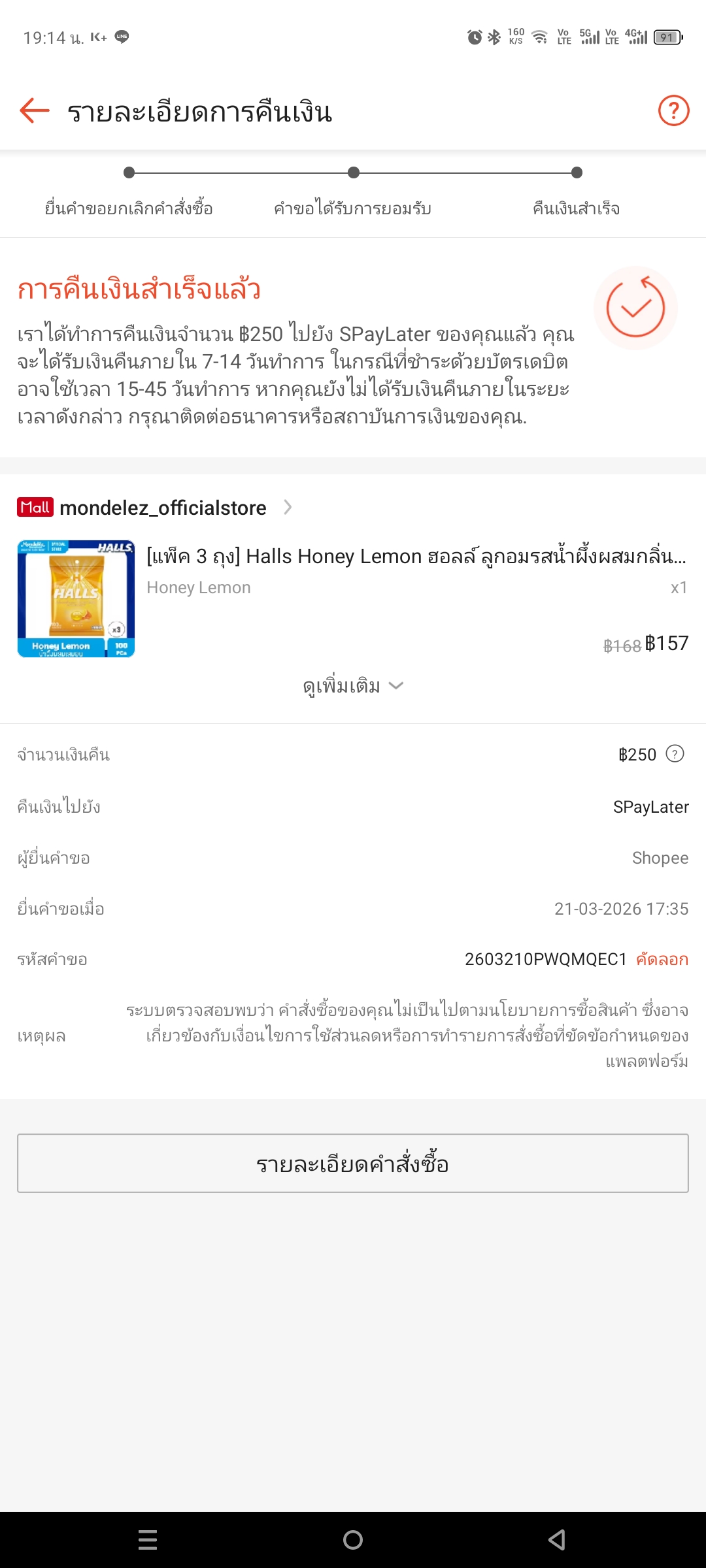 หลังจ่ายเงินแล้วshopeeยกเลิกคำสั่งซื้อค่ะ แล้วบอกว่าพบการละเมิดของบัญชี คืออะไรหรอคะ แก้ยังไงได้บ้าง